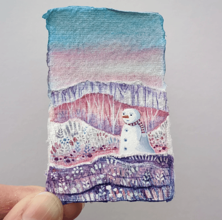 'Tiny Snowman' is a tiny, mixed media collage float mounted into a custom A5 mount. It has been finished with gold details.