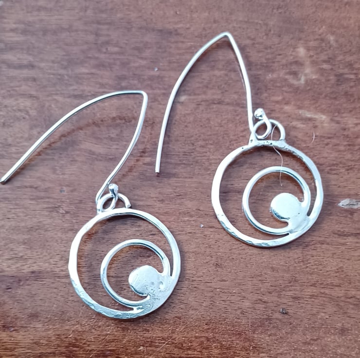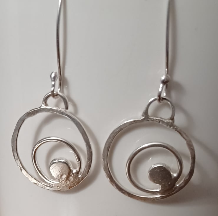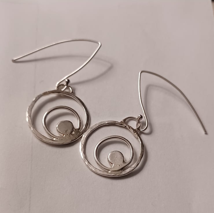 Sterling silver dangle earrings. Two concentric sterling silver rings with a third inner silver circle hang from handmade sterling silver earwires. The rings are 2cm and 1.2cm in diameter, and the inner circle is 4mm in diameter.
