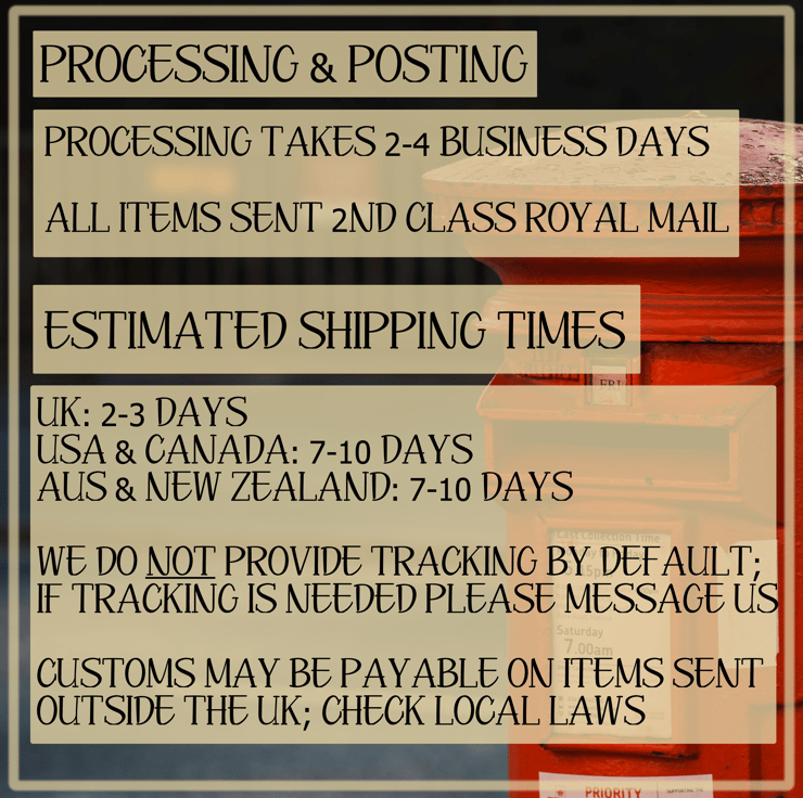 Orders are sent in protective packaging and by Royal Mail 2nd Class both domestically and internationally