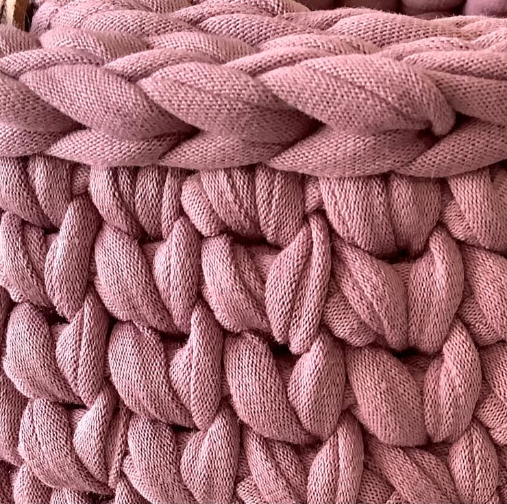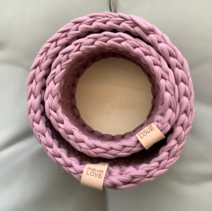 I have crocheted this lovely set of 2 storage baskets using a dusty pink cotton tshirt yarn onto wooden bases.