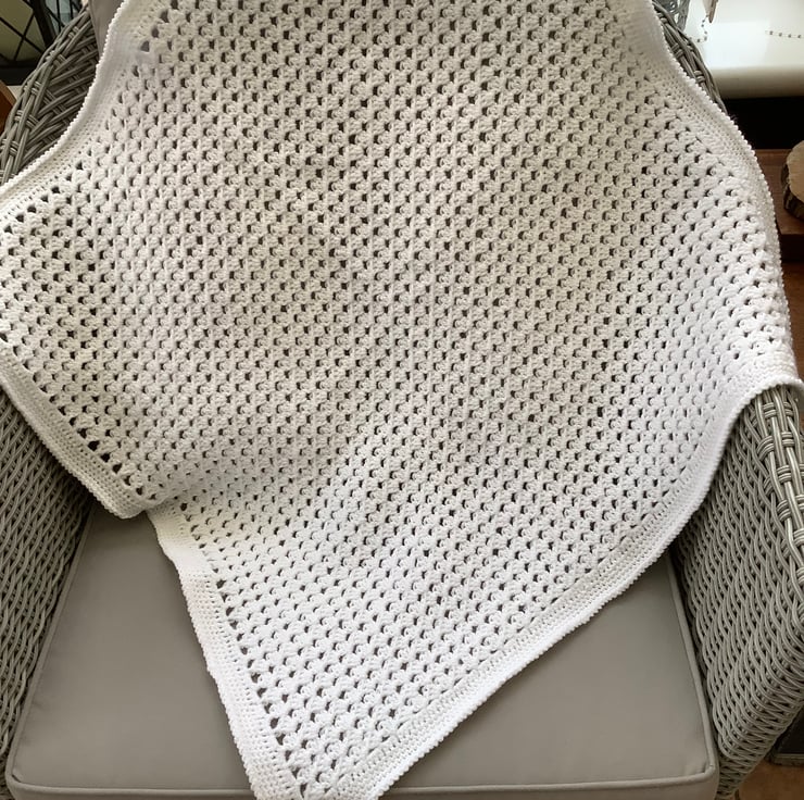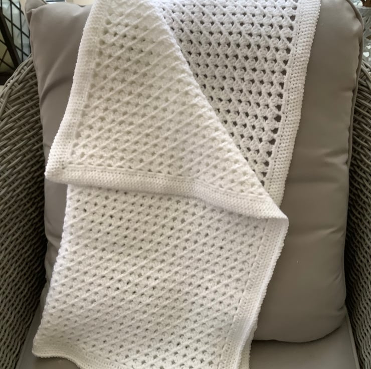 I have crocheted this corner to corner baby throw/blanket using a granny stitch in a lovely snuggly soft acrylic baby yarn called Bambino, I have then added a pretty border to finish it off.