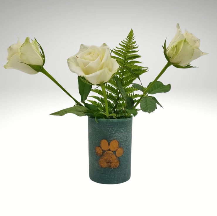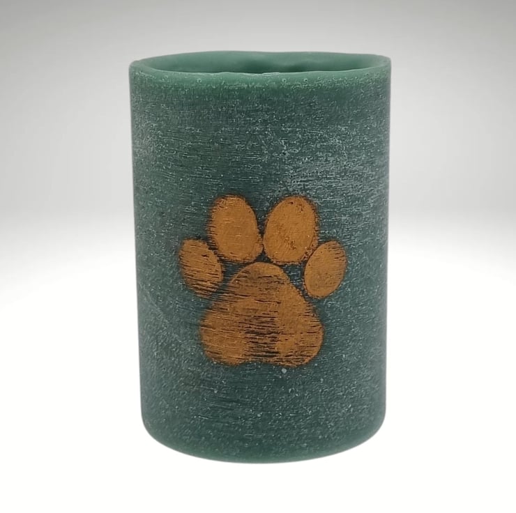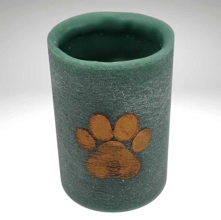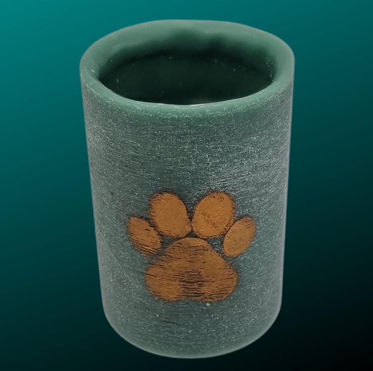 This wax cylinder vase is made of green wax with a gold paw direction. It is a medium height of 12 cm, and 8 cm wide making it extremely useful for a range of other purposes. A lovely gift for cat and dog lovers.