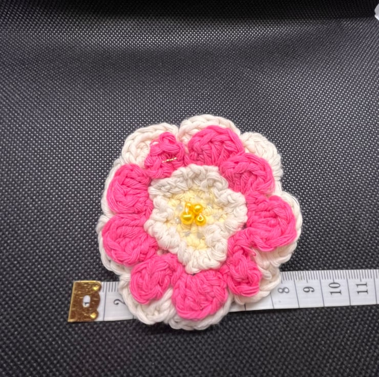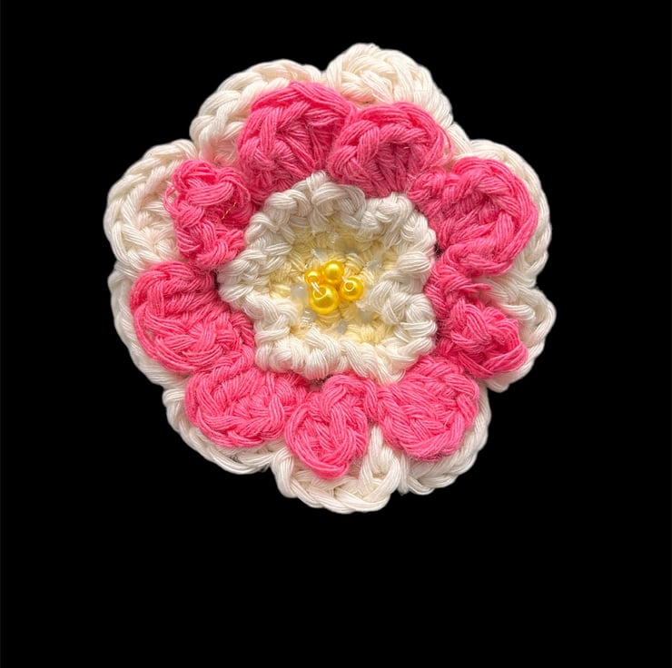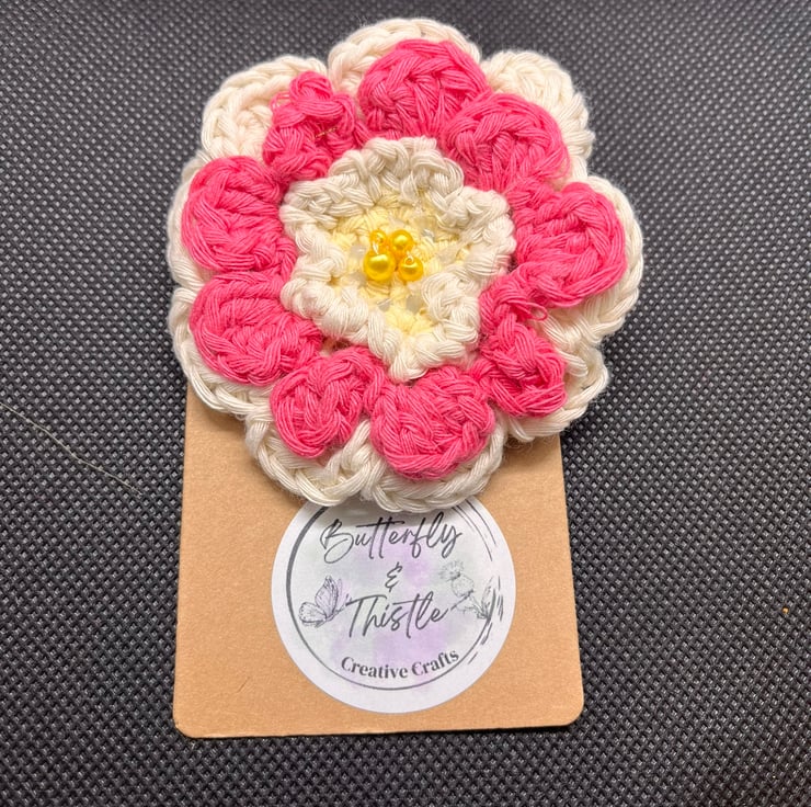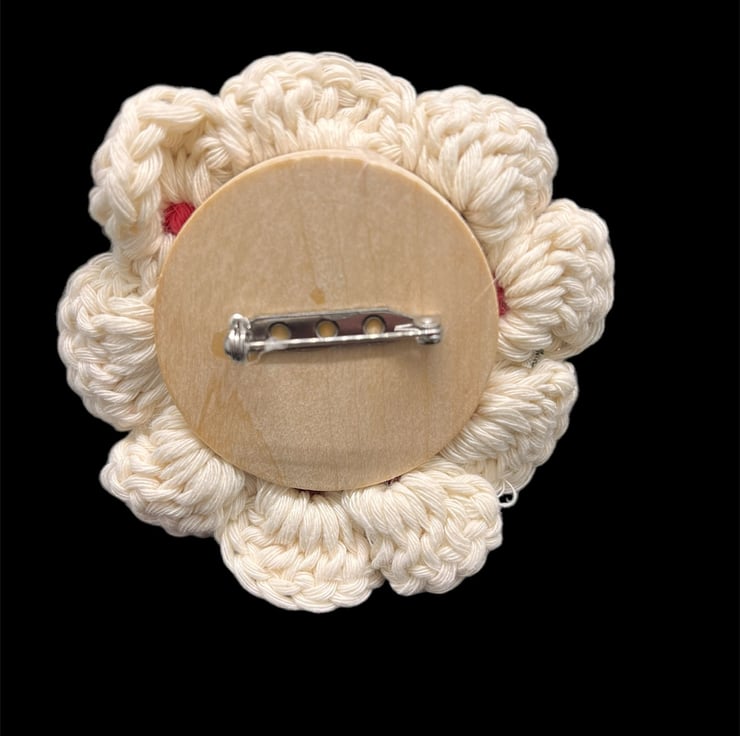 Hand crafted Flower brooch created using crochet and bead enhancements with secured pin back.