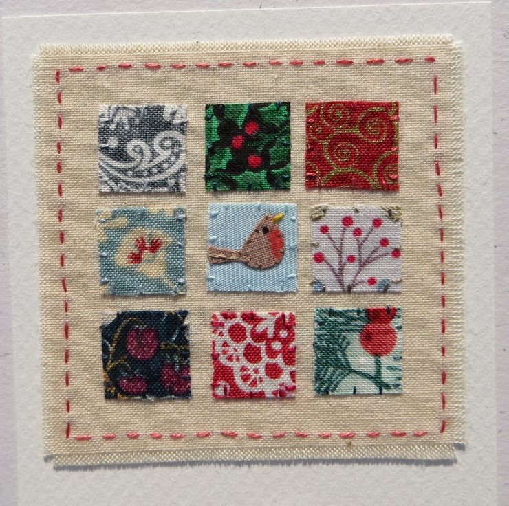 Pretty hand-stitched miniature 'patchwork' applique mounted onto greeting card. The pretty fabrics are chosen with care and the centre square has a tiny applique robin stitched onto it. Very fine and delicate work. My hand stitched cards are gifts in themselves to keep, as well as a card in which to write your message.