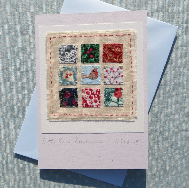 All my cards measure 12 x 9 cm and come with toning recycled paper envelopes in clear protective compostable sleeves - no plastic! Each card is signed on the front and my studio stamp is on the back. Cards are made from stout 100% recycled card - blank inside. The title is written below the textile: 'Little Robin Patchwork'.