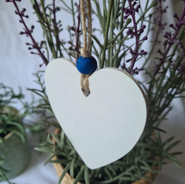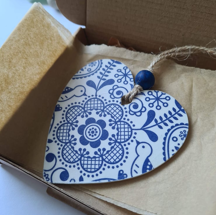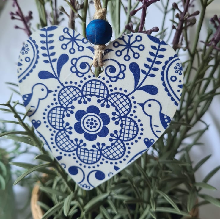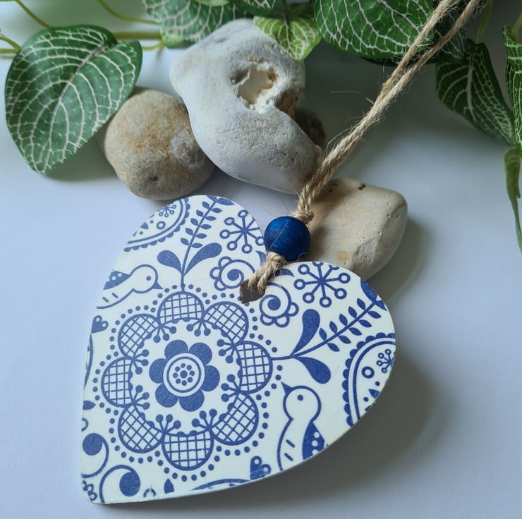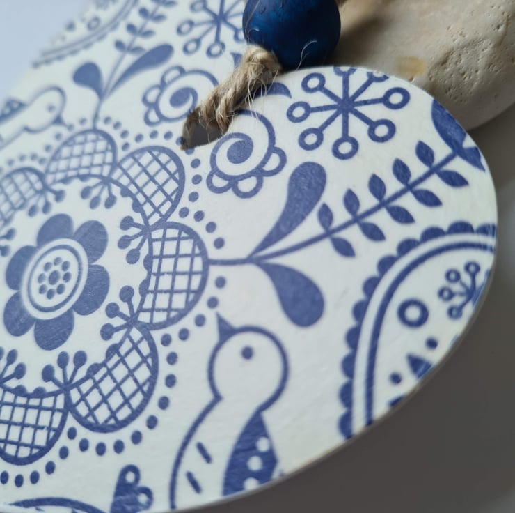 This wooden decoupage hanging decoration has been decorated in a pretty blue and white folk/scandi style design. It has been painted white on the back and sides, then sealed and finished with a blue painted bead and twine.
