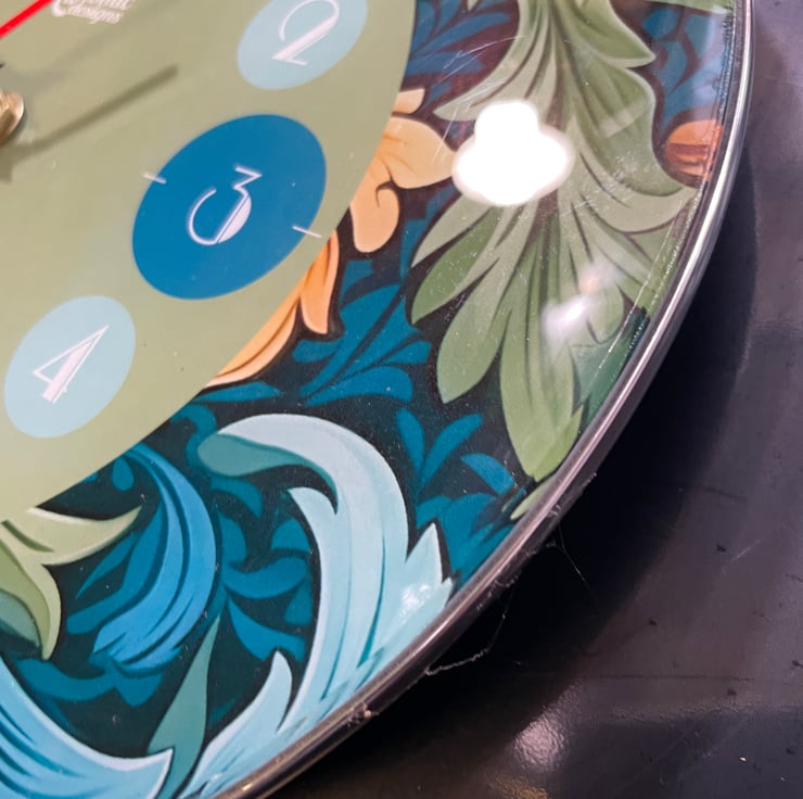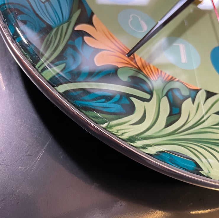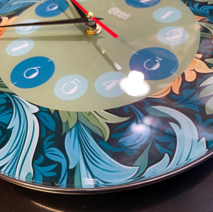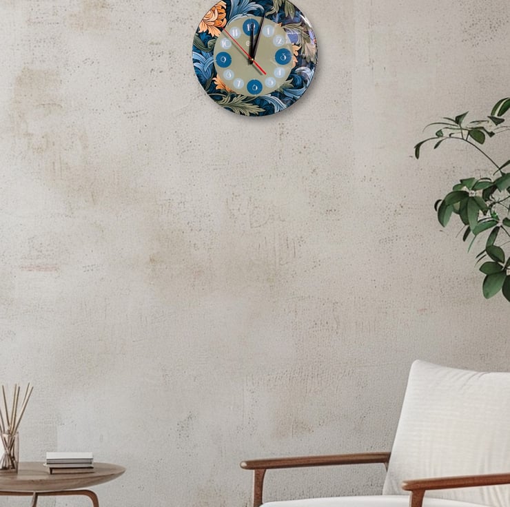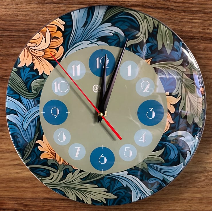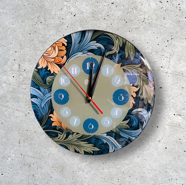 This William Morris inspired wall clock is in the style of Art Nouveau and Art deco fusion, featuring a floral outer design incorporating the clock face which takes its accent colour from the floral design and the clock numbers are in the Art Deco fashion. The name 'The Windsor' is inspired by the famous town with the castle, not too far from our workshop. This wall clock will make the ideal gift for someone special or Christmas, birthdays or any special occassion, or a gift for yourself, so go on, why not...you deserve it!