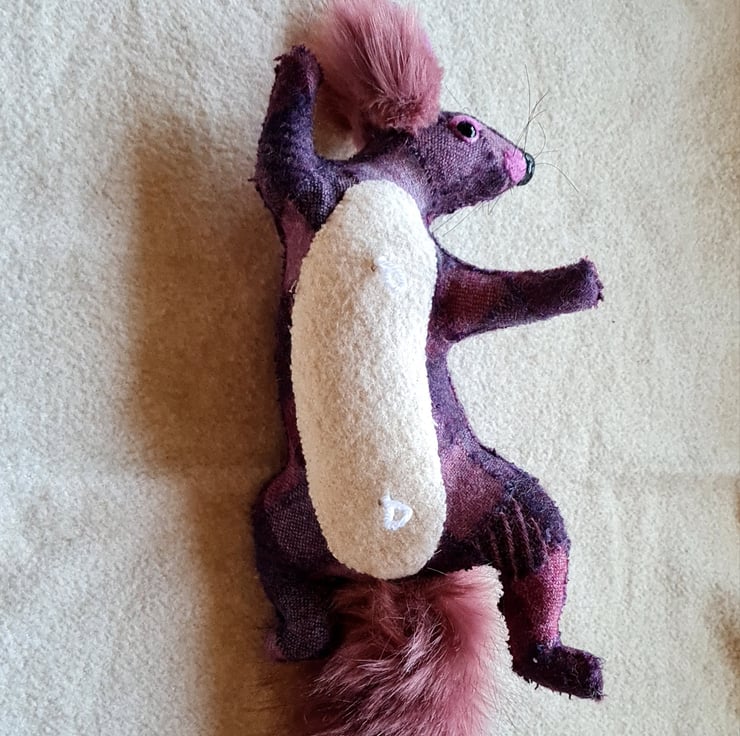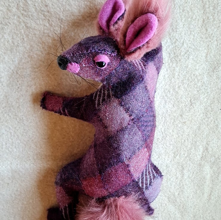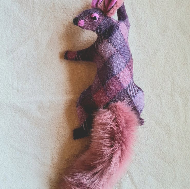 A lifesize faux squirrel I have handmade and covered in hand stitched vintage tweed harlequin fabric.
