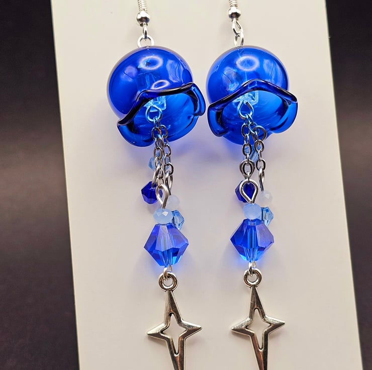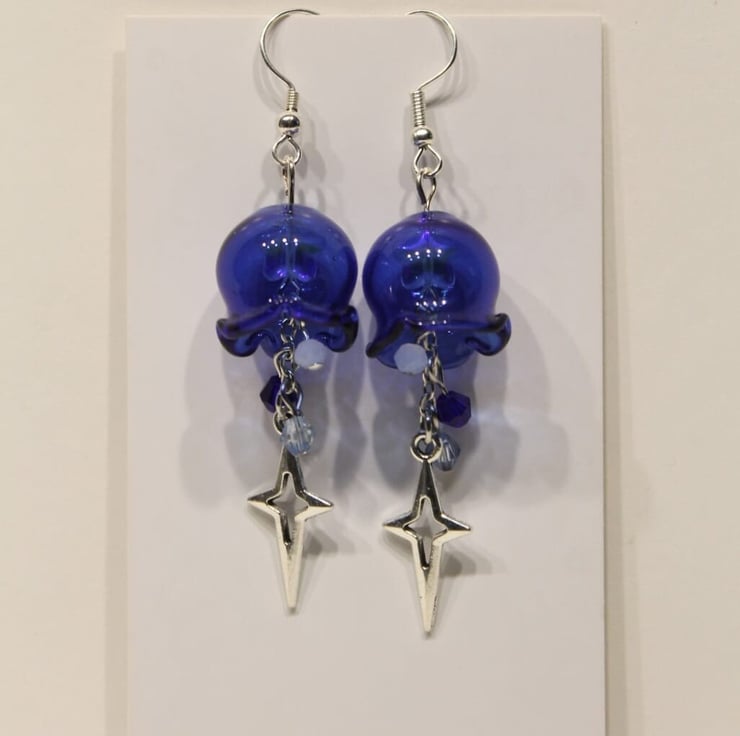 these are blue glass jellyfish earrings handmade by me with iridescent stars inside the jellyfish and it comes with a cute little star bag and a freebie jellyfish sticker