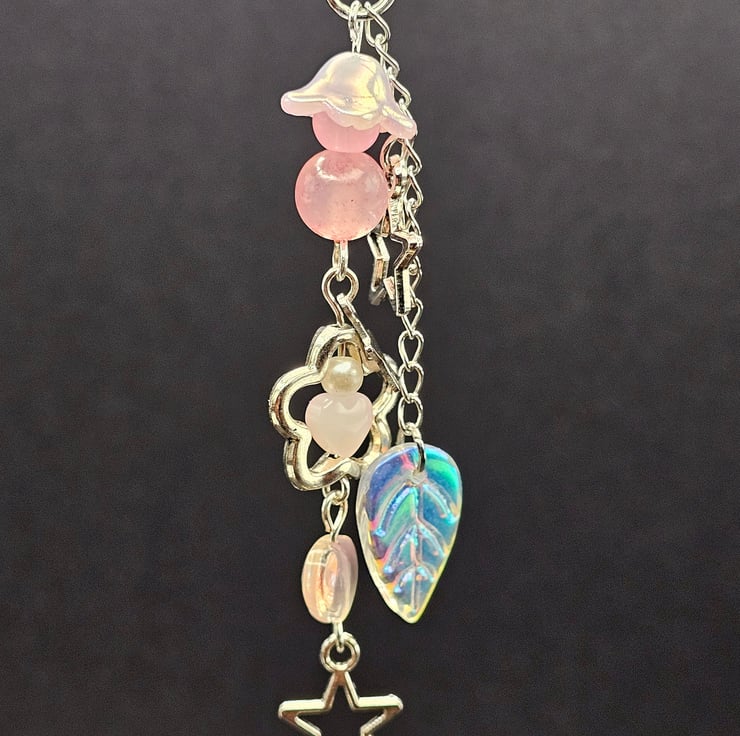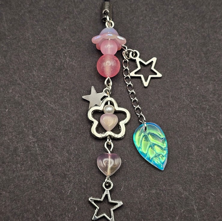 This is a pink iridescent flower phone charm with a glass leaf and metal stars