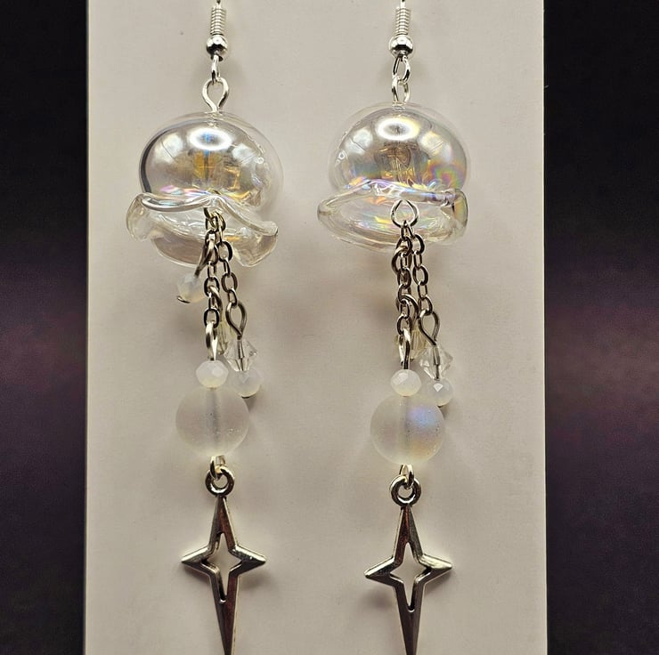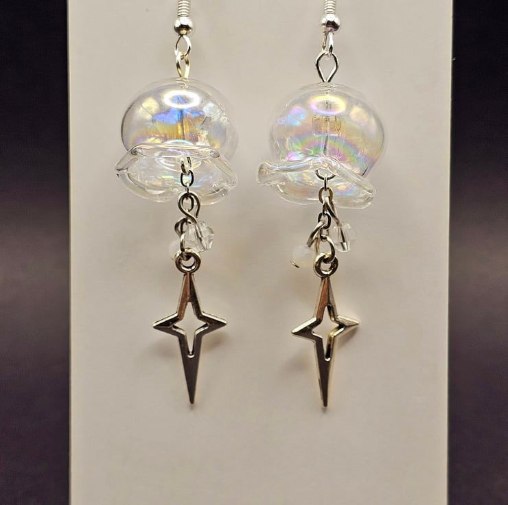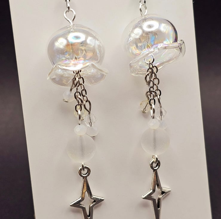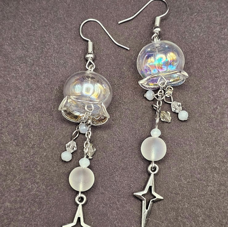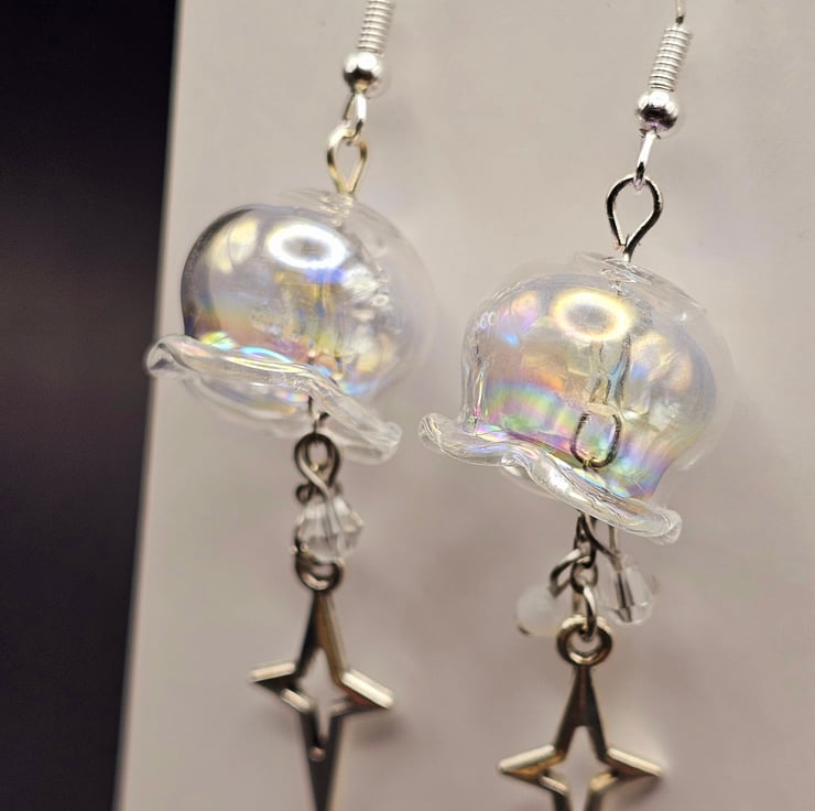 these are iridescent glass jellyfish earrings handmade by me with iridescent stars inside the jellyfish and it comes with a cute little star bag and a freebie jellyfish sticker