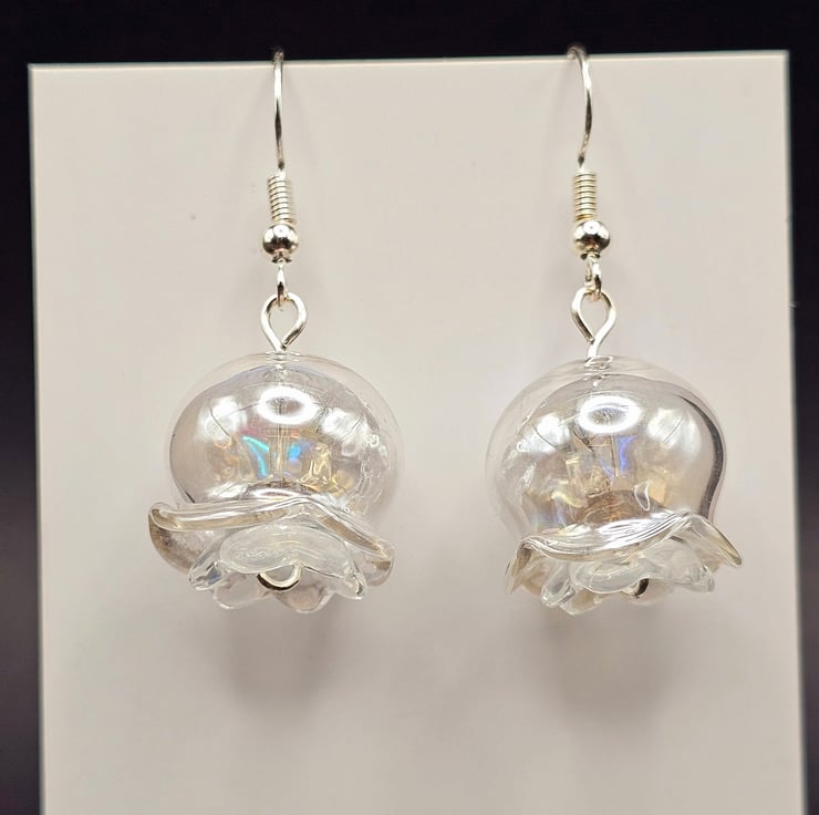 these are iridescent glass jellyfish earrings handmade by me with iridescent stars inside the jellyfish and it comes with a cute little star bag and a freebie jellyfish sticker