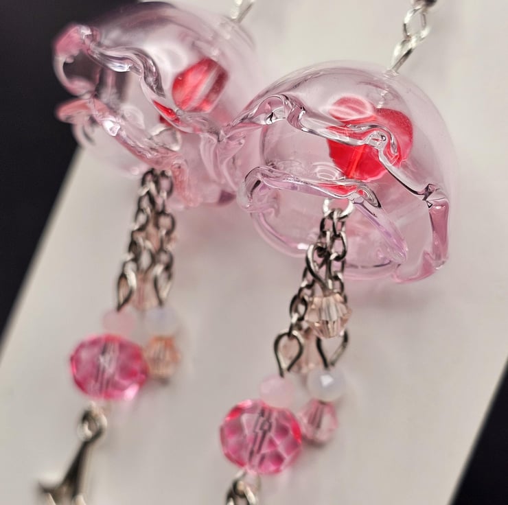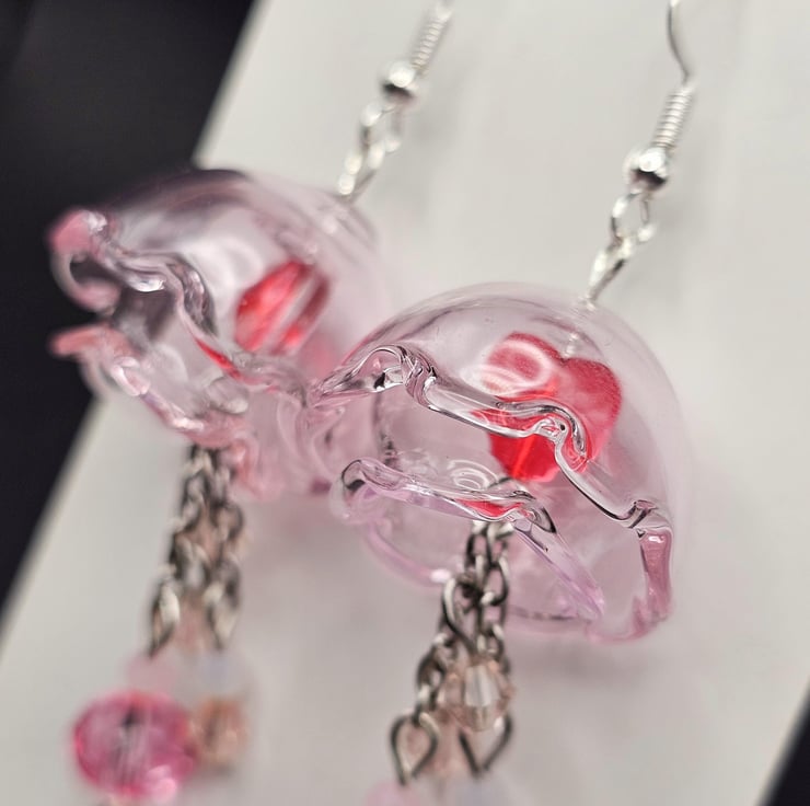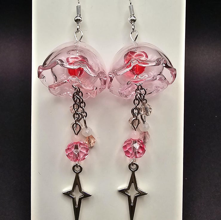 These are pink and red glass jellyfish earrings handmade by me with glass hearts inside the jellyfish and it comes with a cute little star bag and a jellyfish sticker
