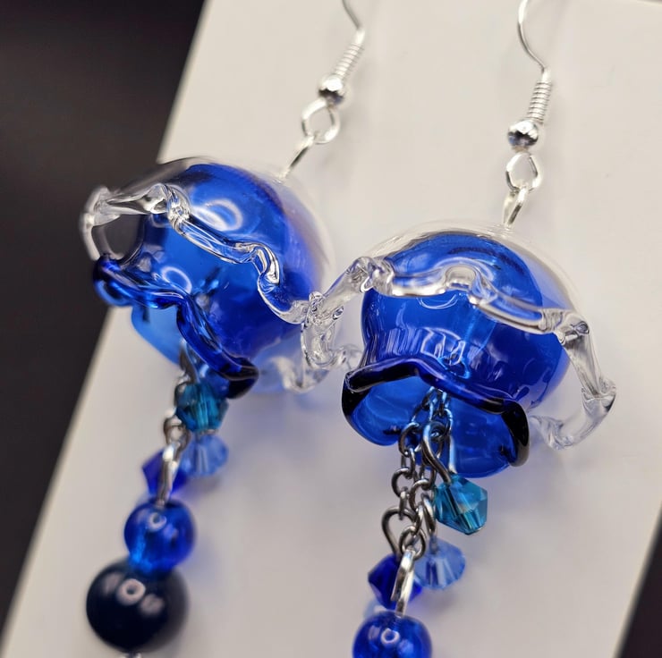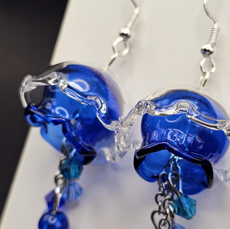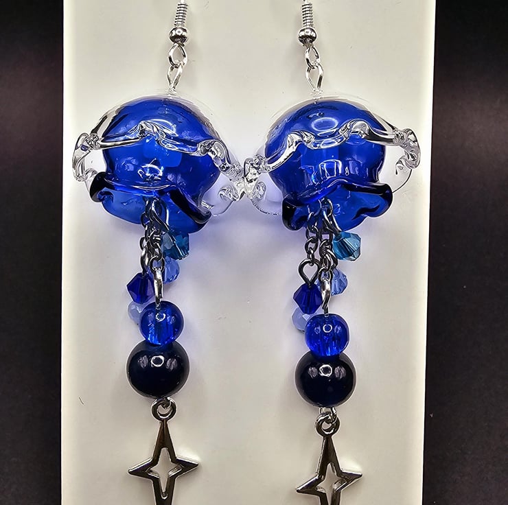 These are blue glass jellyfish earrings handmade by me with glass stars inside the jellyfish and it comes with a cute little star bag and a freebie jellyfish sticker