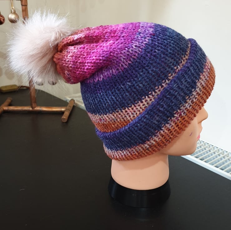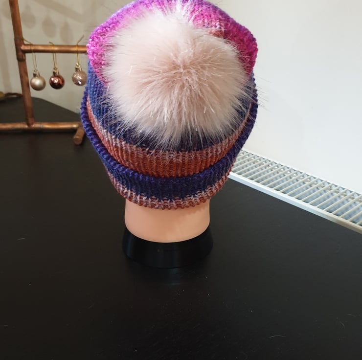 This hat has been made using a Sentro therefore is knit stitch and double thickness. Pom pom is easily removed for washing. Colourway is Raspberry. I used a Premium Acrylic yarn for this eye catching piece.