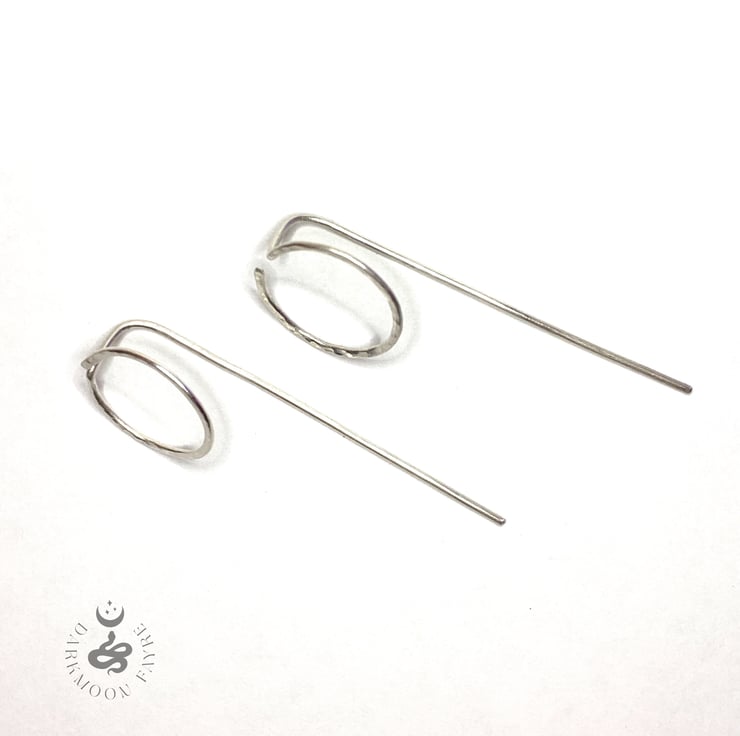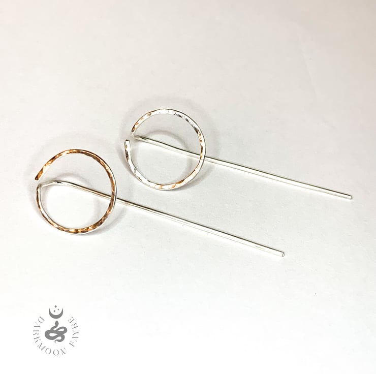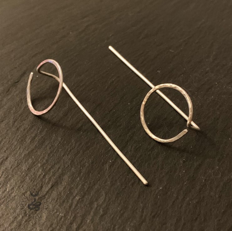 Open circle earrings, crafted from 100% recycled 925 Sterling Silver 1mm wire, are cold forged (using hammer and anvil techniques) to create a luxuriously modern minimalist aesthetic. Due to being handmade, miniscule differences may be seen, but this only adds to their charm.