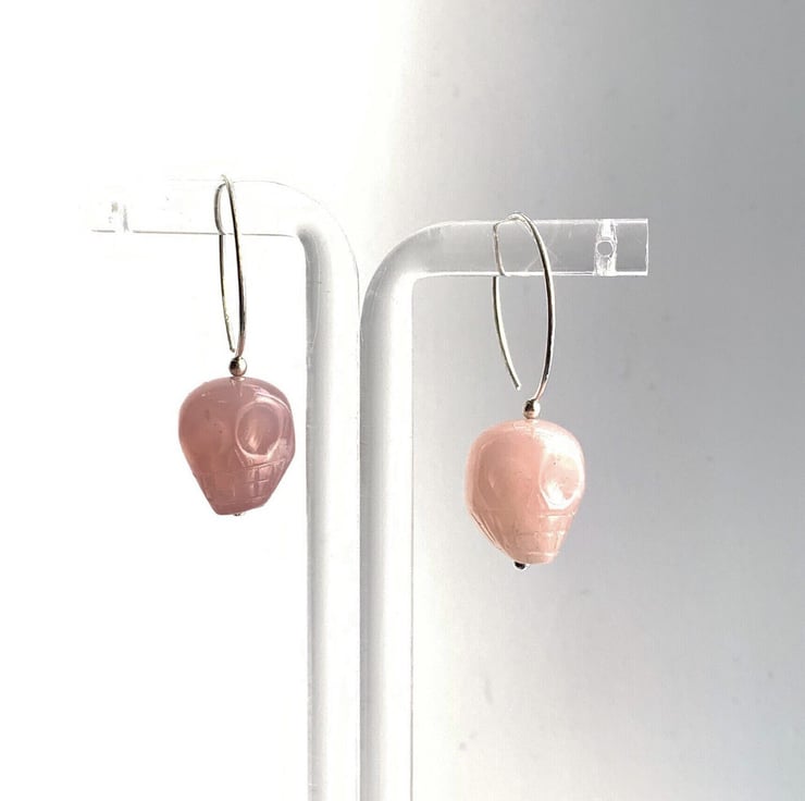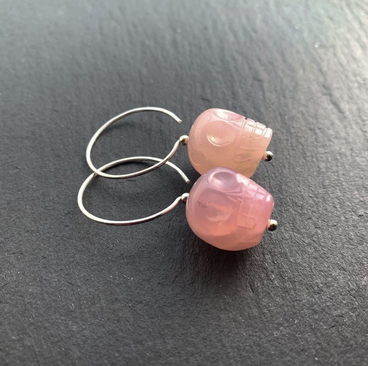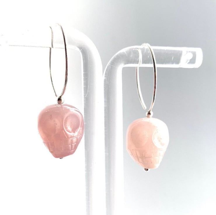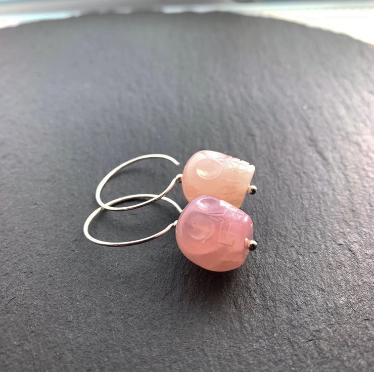 All 925 Sterling Silver Hand Forged Hoop Ear-wires. Rose Quartz Carved Skull & Beads (skull are cut from natural Rose Quartz, so each and every skull will have its own unique shading, character and inclusions.