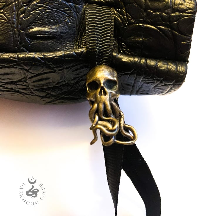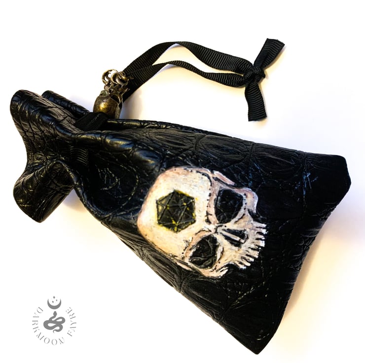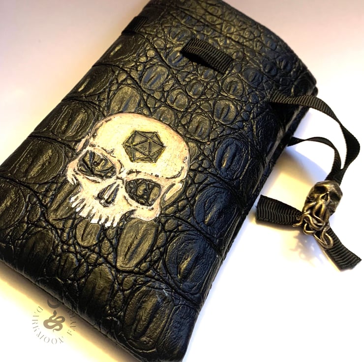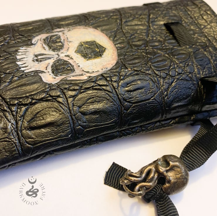 Hand painted skull vegan leather dice pouch with a jewellery quality Cthulhumanoid skull brass toggle. An eye-catching accessory with sinister style - perfect for adding a touch of creepy flair to your favourite table-top game!