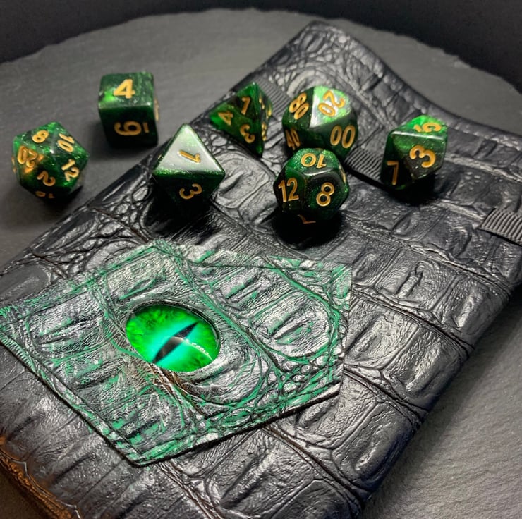 Green Dragon Polyhedral 7 Dice Set and Hand Painted Dragon Eye Pouch