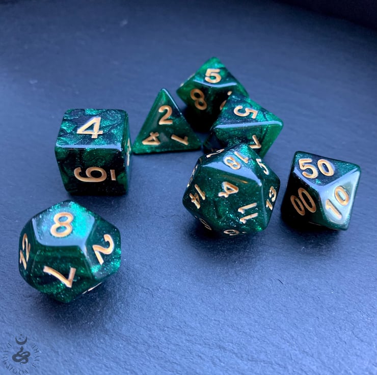 Dice colour: Green/black pearly swirls with a fine silver glitter
