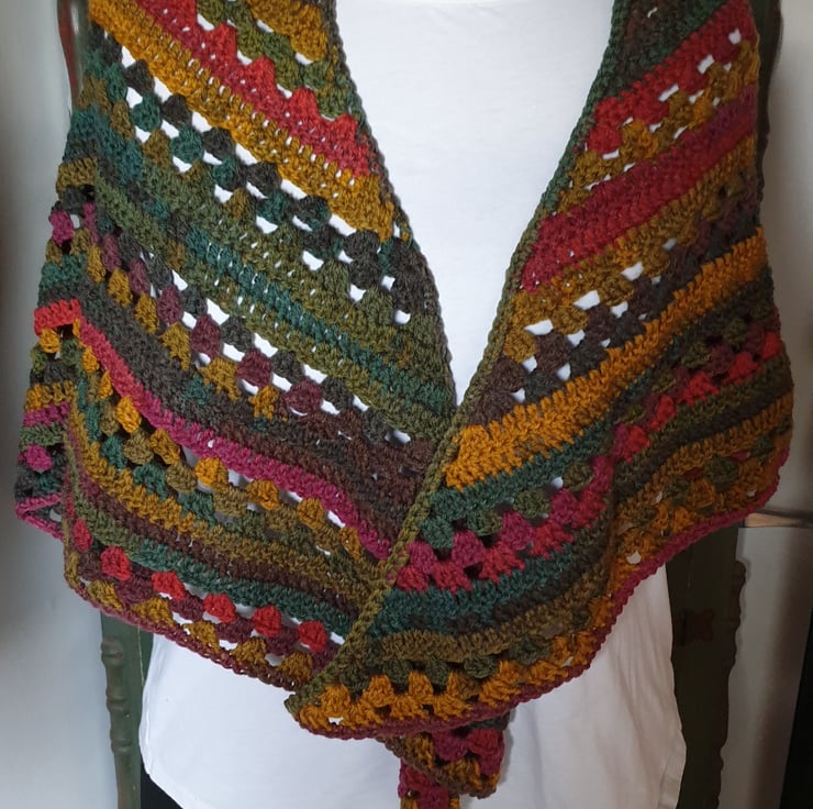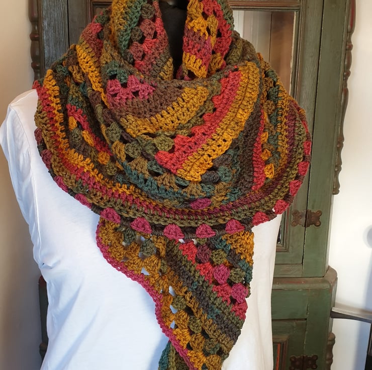 The style of hat was from a free pattern called the Britt Slouchy Hat. The colourway of the wool lent itself to the Hippy Era hence the hat pattern. Just different from all the other slouchy patterns out there. Sometimes it's handy just to wrap up in a shawl and feel cosy. The Shawl is a versatile piece for any wardrobe.