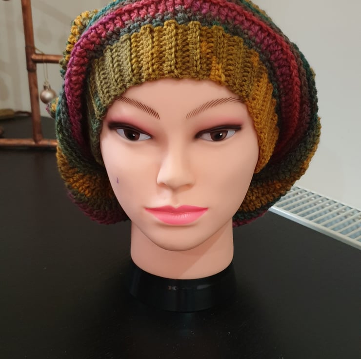 I see this as a boho Slouchy with matching shawlette/scarf. Crocheted using a premium Acrylic yarn. Beautiful colours with a hint of hippy/folksy charm. Perhaps belongs in the late 60's but it's all a matter of taste.