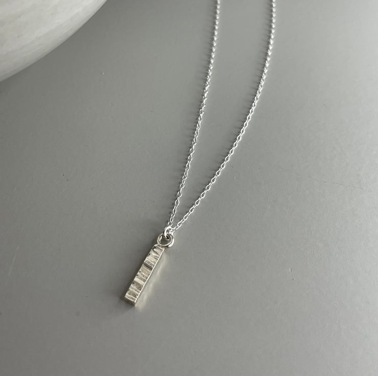 A modern stylish necklace with organic bark effect texture. This elegant dainty bar pendant is made from recycled Sterling silver and is 15mm long hung from a fine 18" / 46cm chain. Co-ordinating earrings are available and different chain lengths are also available upon request.