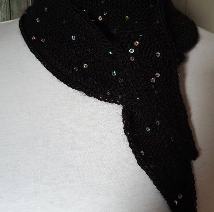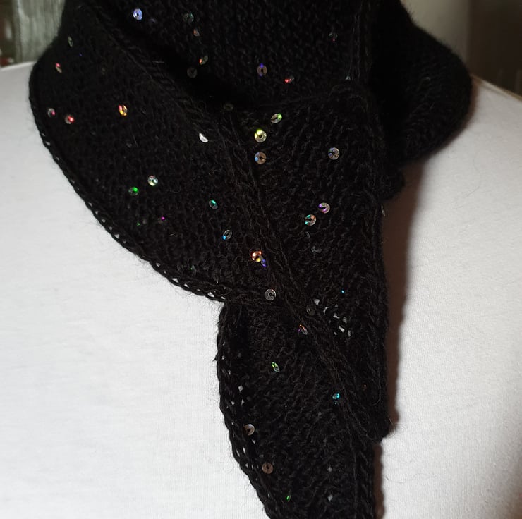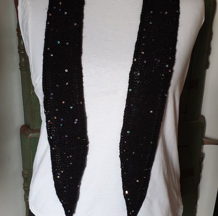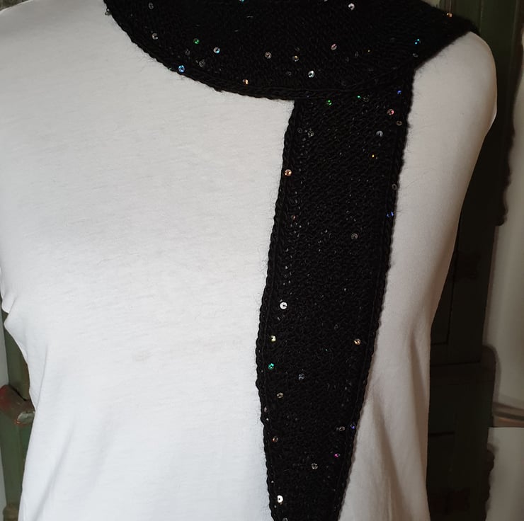 A skinny scarf/neck scarf. A rather cute little scarf made with Acrylic/Wool yarn with added little sequins. I mostly crochet but this yarn lent itself to knitting needles as opposed to crochet hook. It has a I cord edge which adds to the simplicity. It could be made longer by request.