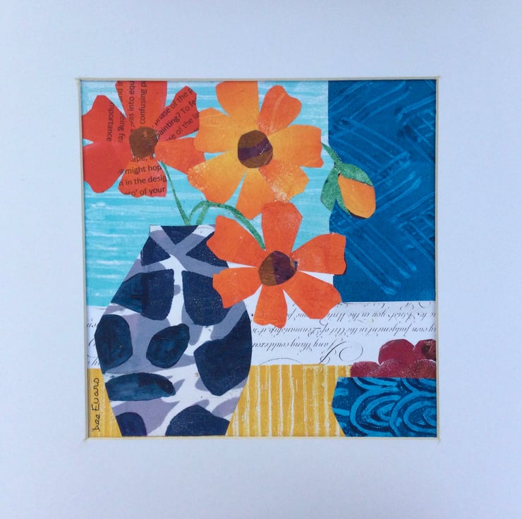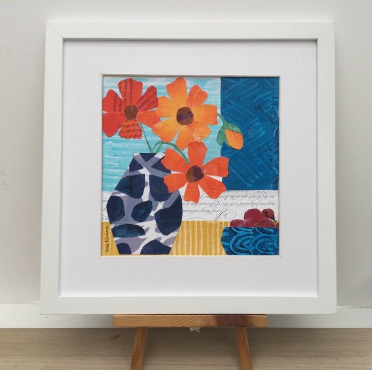 This is another small original collage, in a series of pots with flowers. The image measures 20cm x 20cm and in the frame measures 33cm x 33 cm overall. Once again I decided not to paint a background and just selected the printed papers to use from a vast collection. These were then cut, assembled to form a semi-abstract image and fixed to mountboard. It has a white mount and plain simple white glazed frame.