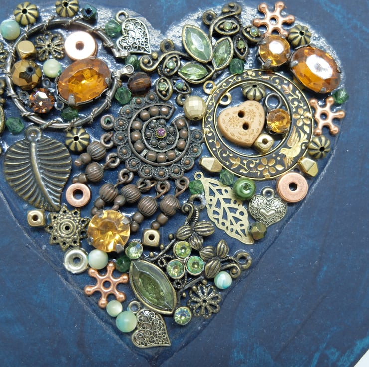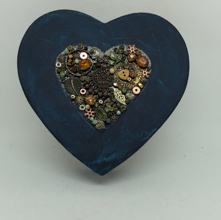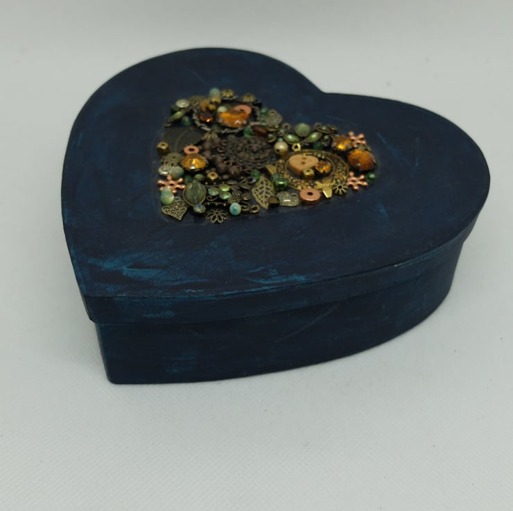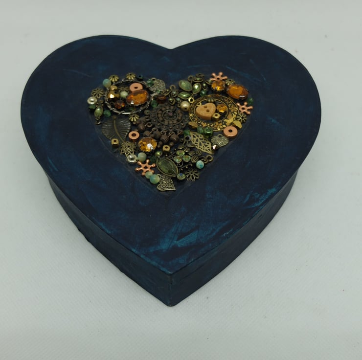 Box painted with dark blue acrylic paint. Assorted beads and jewellery parts stuck on in a heart-shaped design to the lid.