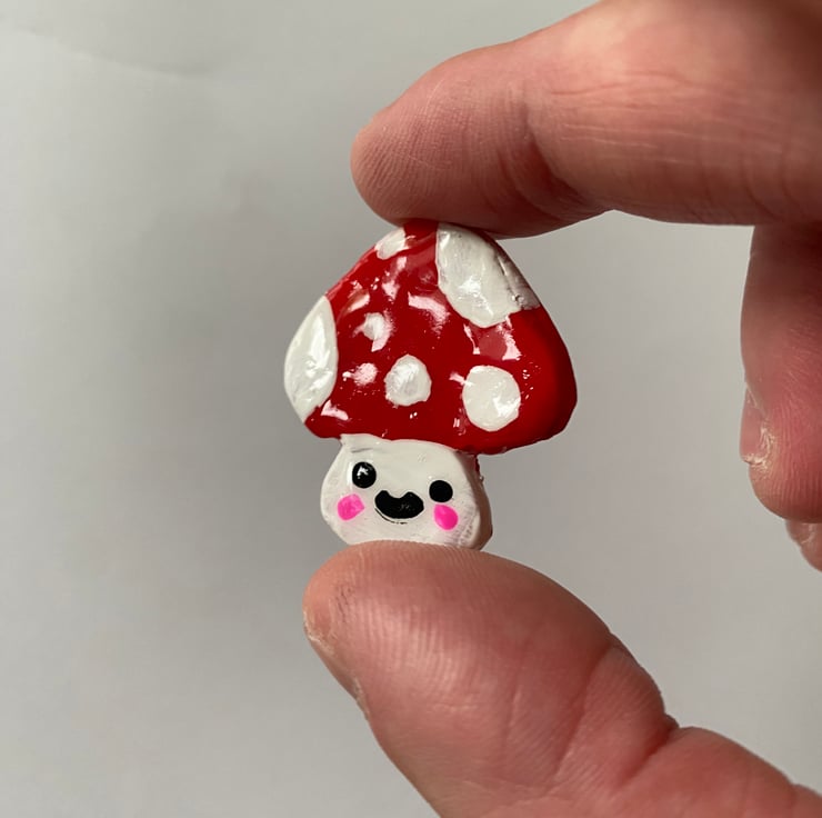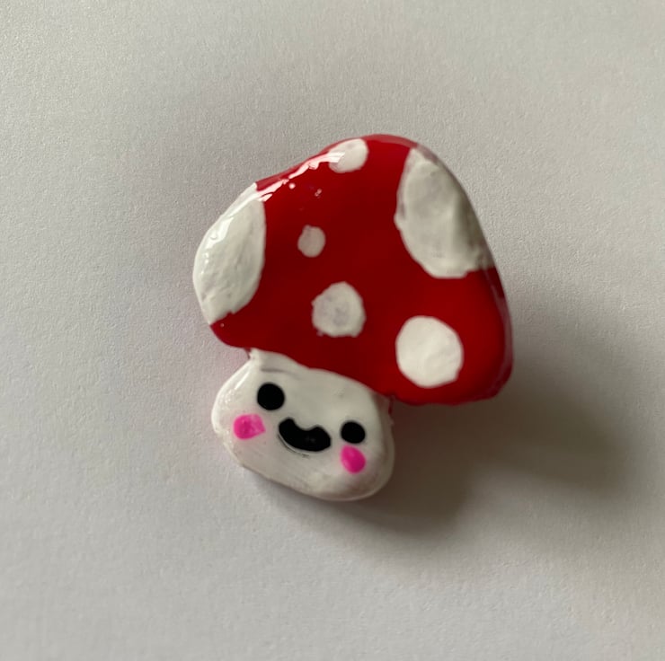 A cute and adorable polymer clay pin of a Mushroom.