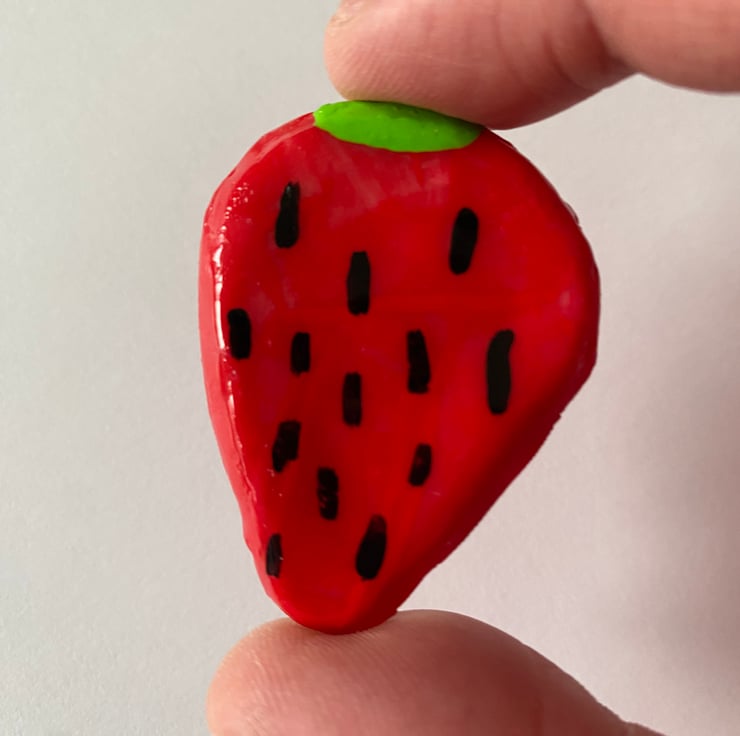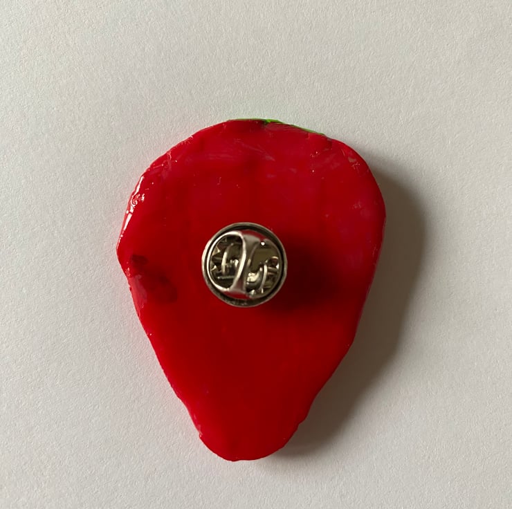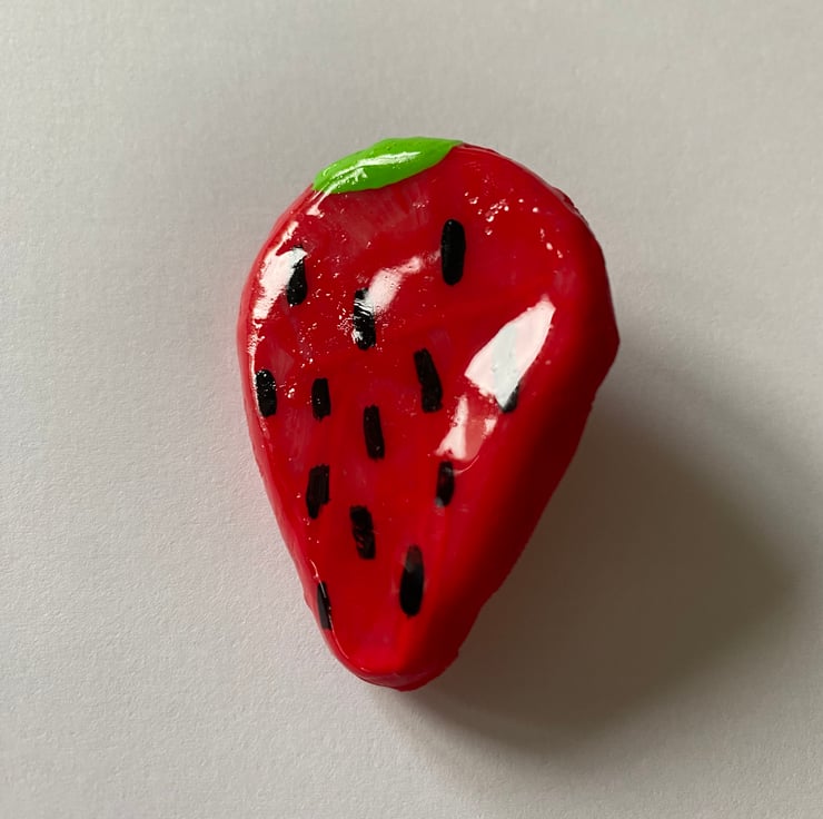 A cute strawberry clay pin handmade from oven-bake polymer clay, painted with acrylic paint and then glossed for a shiny finish on top. Pin is attached on the back of the clay.