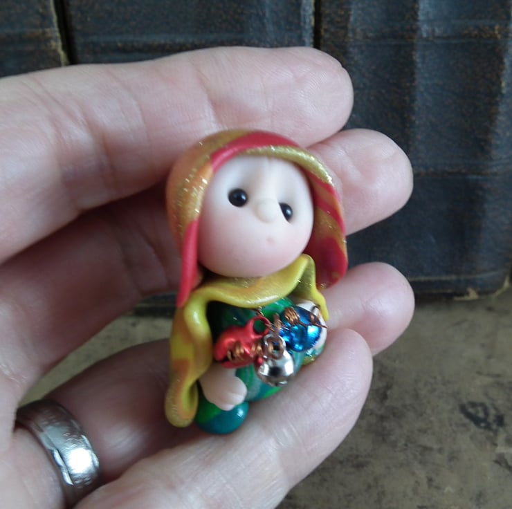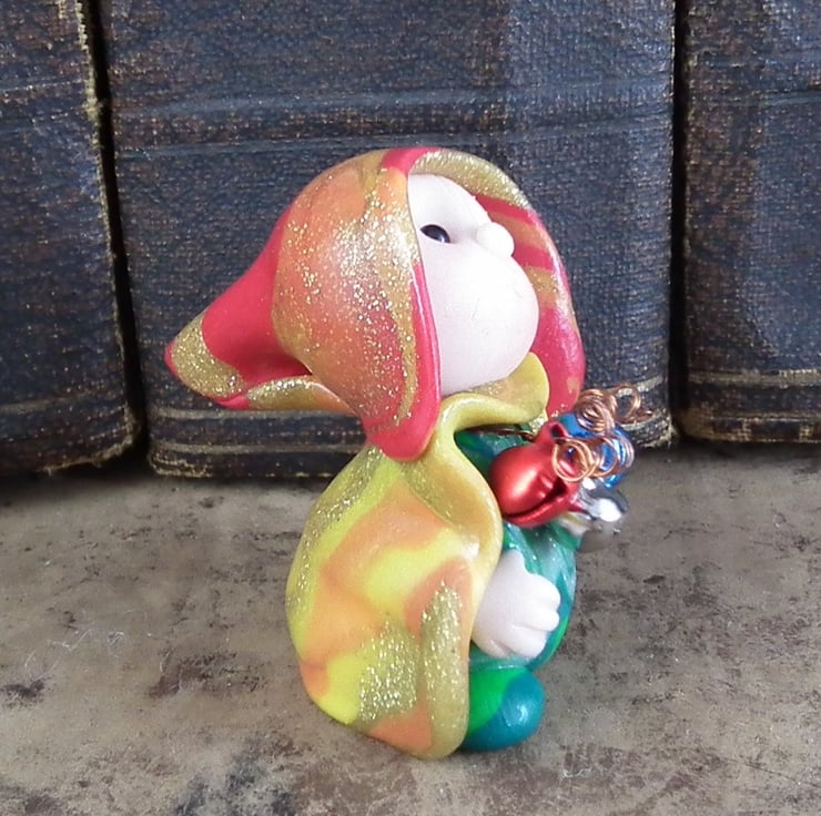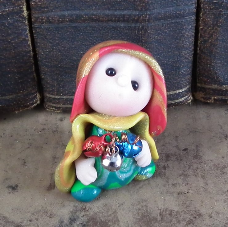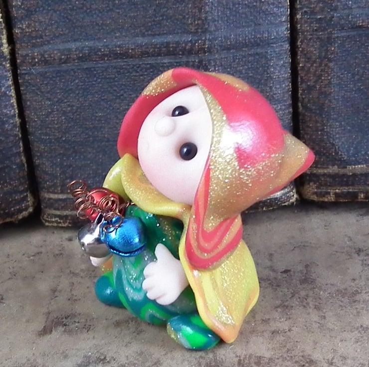 This is a 'one of a kind' creation having been entirely handmade without the use of moulds here at my studio on the Sussex Coast. Modelled with own blend polymers, painted with heat set paints before sealing with lacquer, Tippi has sparkling black onyx eyes and three wired bells. Tippi is just one and a half inches tall.