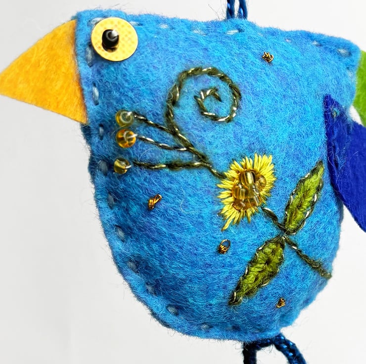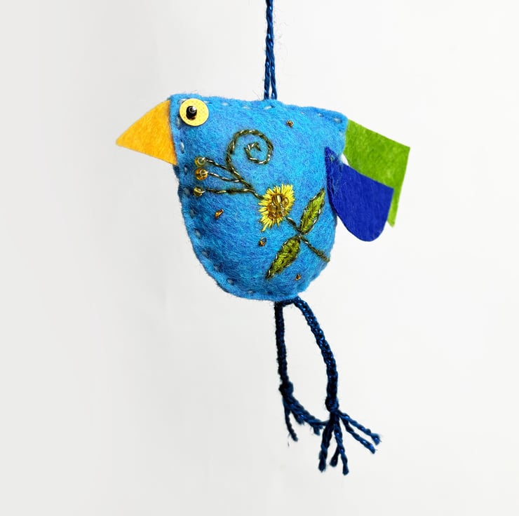 This is a bird shaped hanging decoration. It has been made out of colourful felt fabric and the body is hand embroidered with a floral design. It has a string attached to hang it with - it can be used as a decoration, tree trim or bag charm.