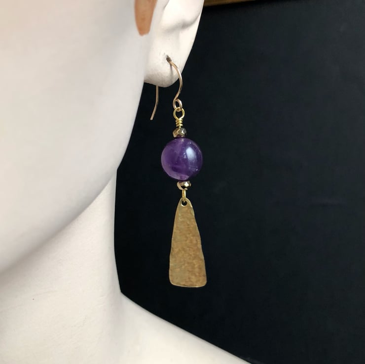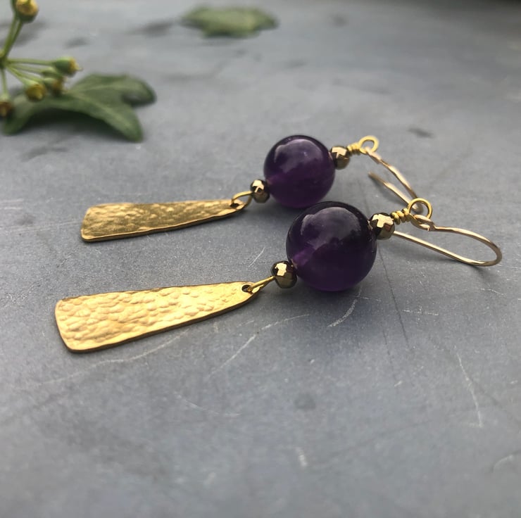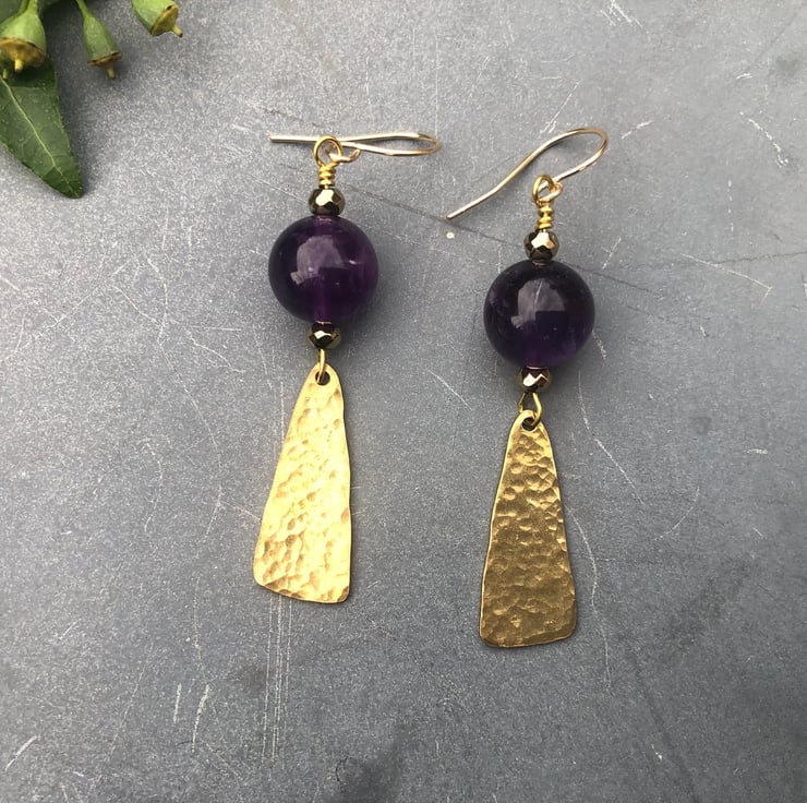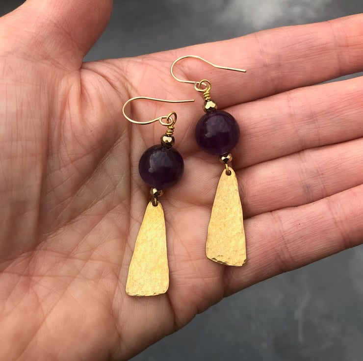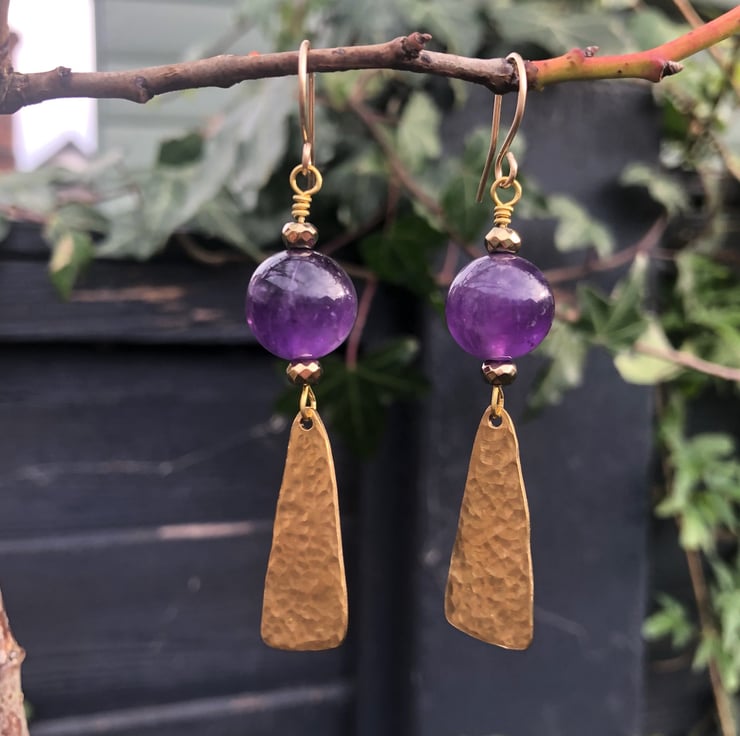Lovely dangly Boho Luxe earrings with 12mm natural Amethyst gemstone beads and handmade hammered raw brass dangles that I have sealed with jewellery wax to help prevent tarnishing.