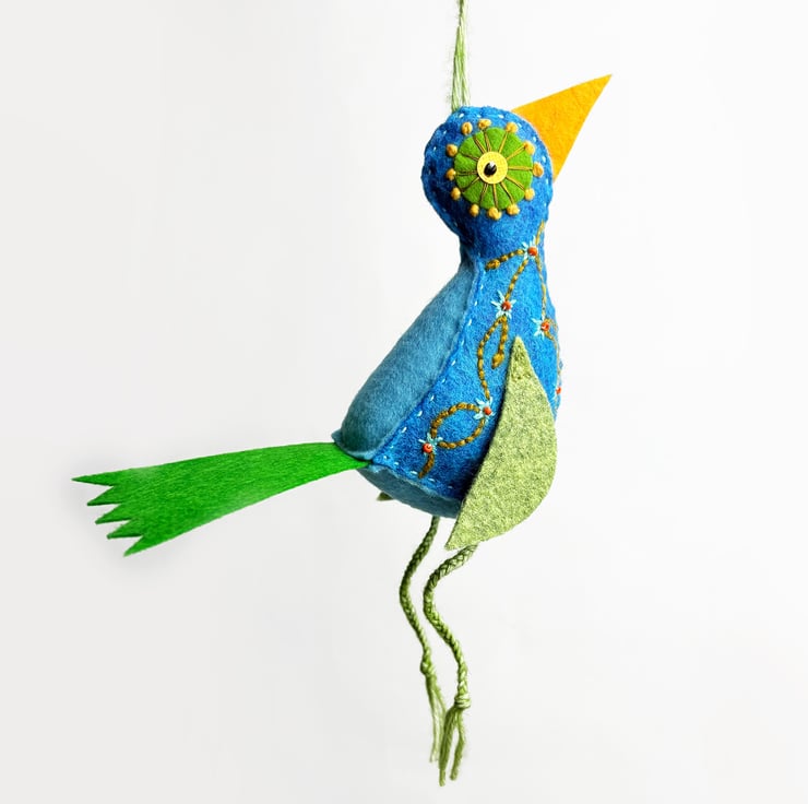 The bird is made from pink felt with a light blue coloured tummy. The tail is made from a lovely bright green felt. The bird has a eye embellished with beads. the main body is hand embroidered with my Almond Blossom design.The stuffed bird is 3D and has plaited wool legs and there is a piece of wool attached to hang it from. The size of the ornament is 4 inch (10cm) long and 2.25 inch (6cm) wide (at widest point). This piece is completely stitched by hand.