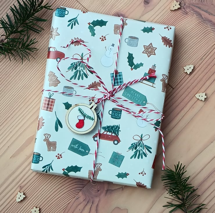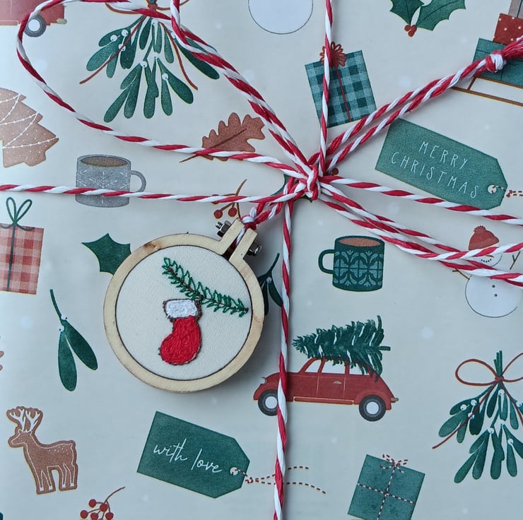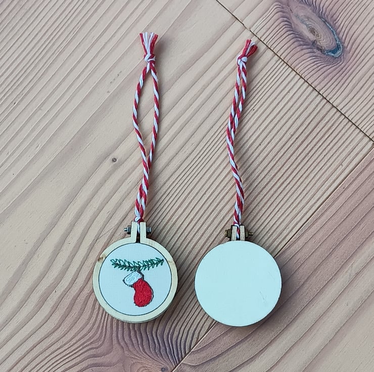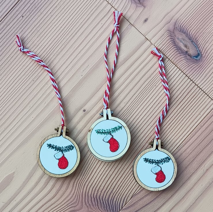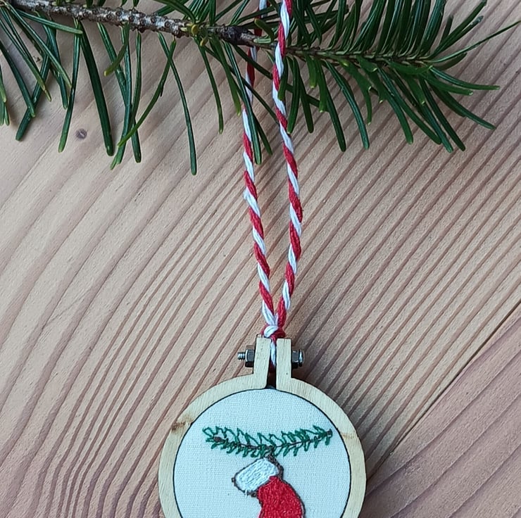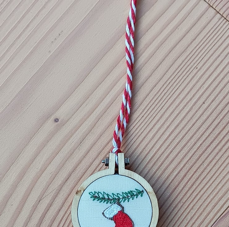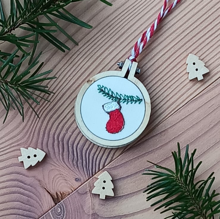 Free motion embroidery in different coloured threads make up the design of a bright red stocking with white cuff hanging from a pine branch. The embroidery is put into a tiny embroidery hoop and a wooden disc is glued on the back to make it neat. There is a red and white stripy string to hang it.