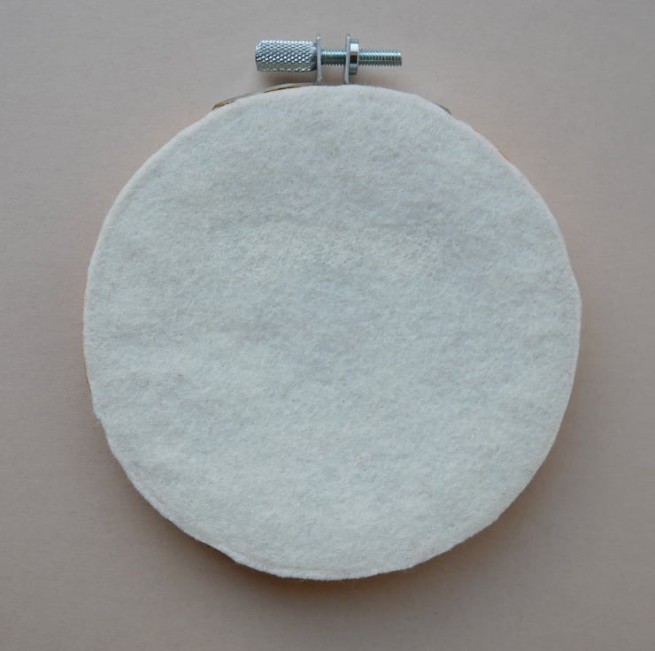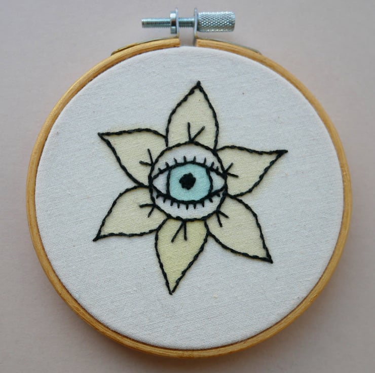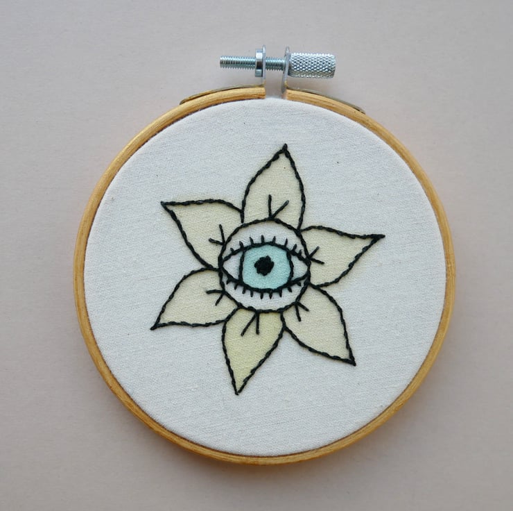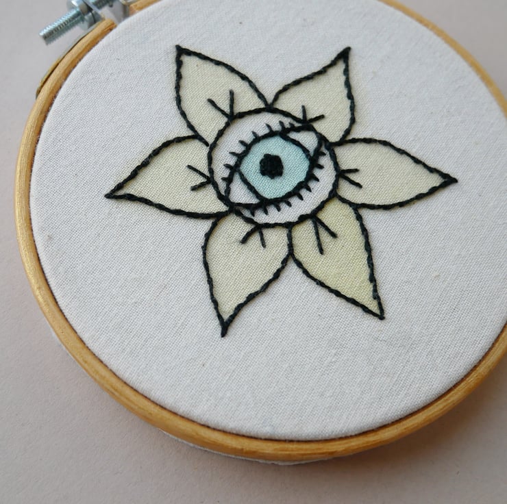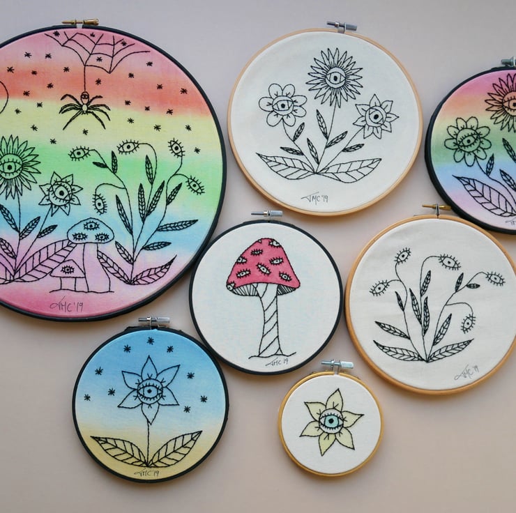 An original piece of artwork that has been hand-painted and stitched and set into an embroidery hoop.