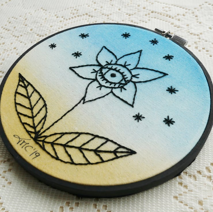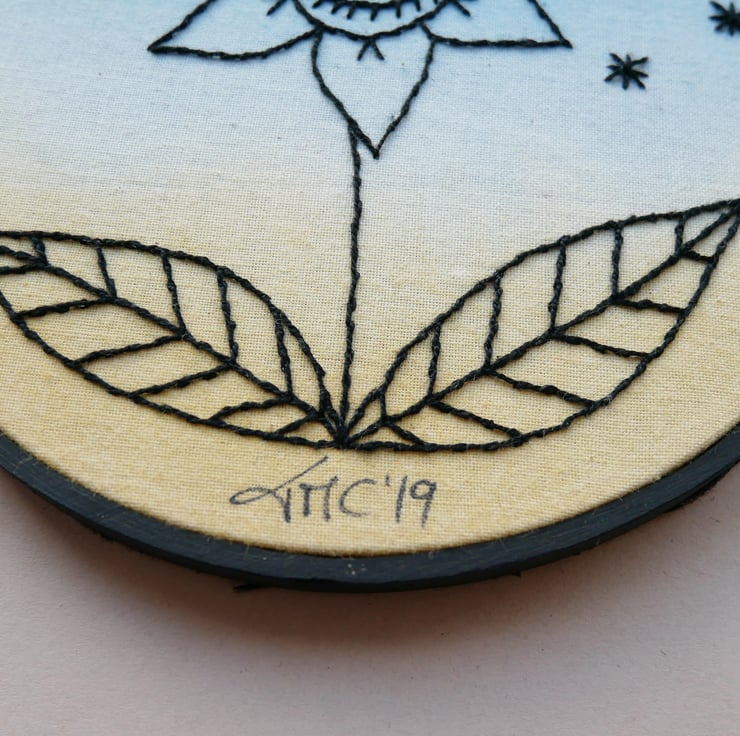 An original piece of artwork that has been hand-painted and stitched and set into an embroidery hoop.