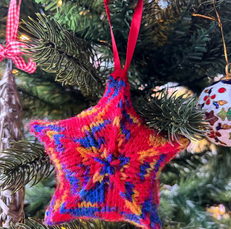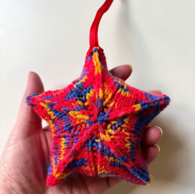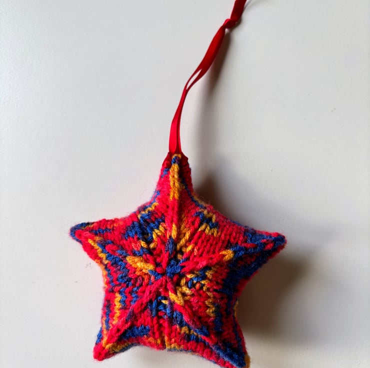 This is a lovely little 5 pointed star, knitted in multicoloured yarn then stuffed with toy grade wool stuffing which conforms to EN71, BS1425, BS5852. The star is finished with complimentary ribbon to hang.