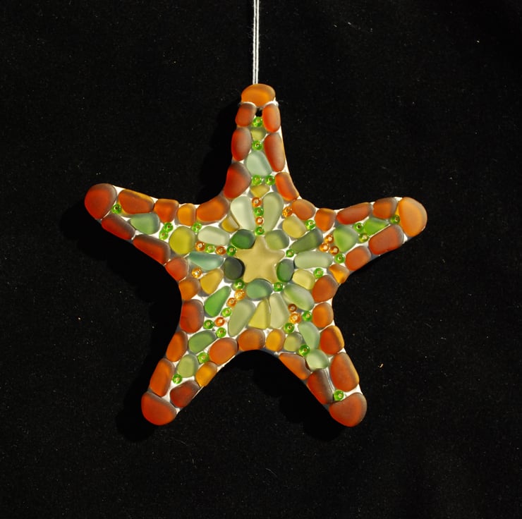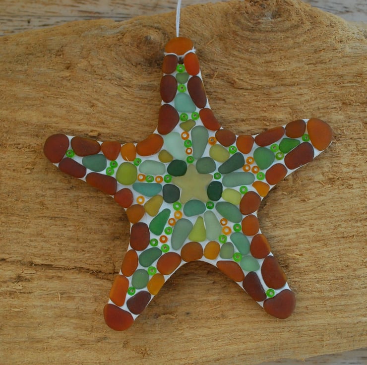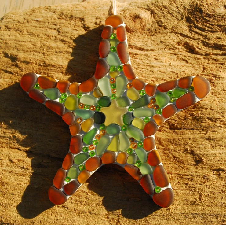 Our mosaic hangers are individually hand made in Chudleigh, Devon. We collect our materials ourselves, mainly from local beaches. Each piece of glass is unique, so each hanger is unique. We only use materials which have rounded edges, which is why we tumble pieces which have rough edges (this continues the process begun by the waves) until they are smooth.