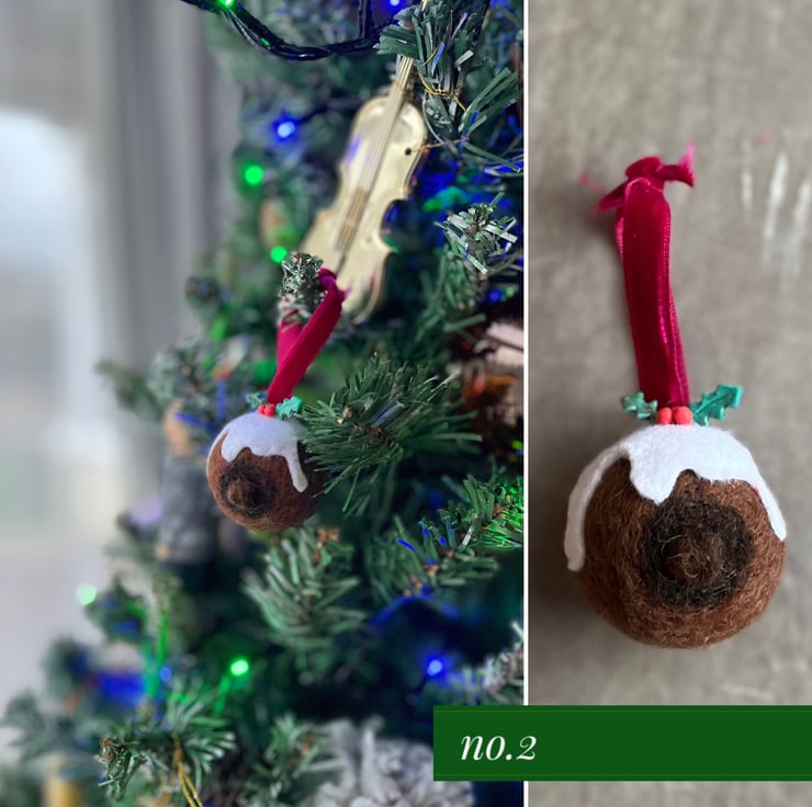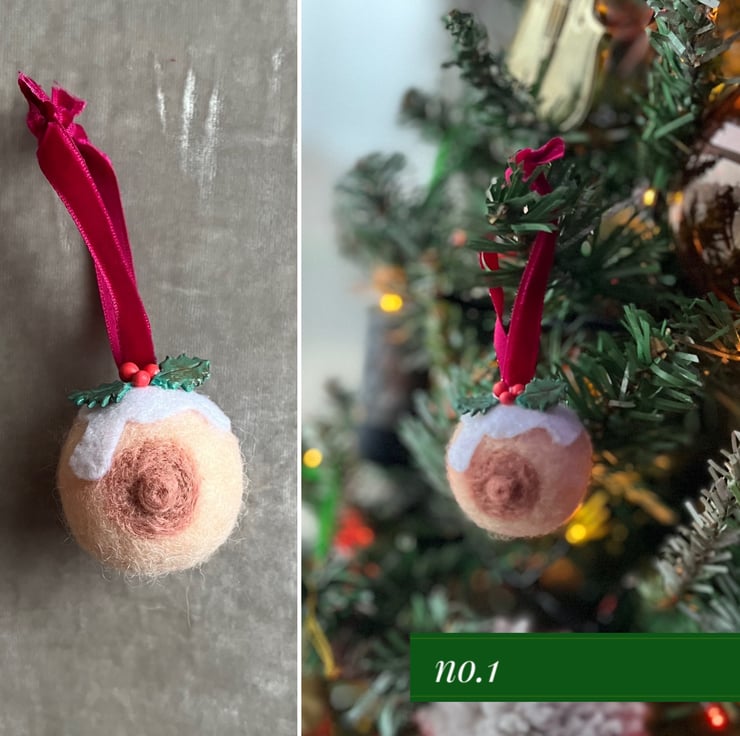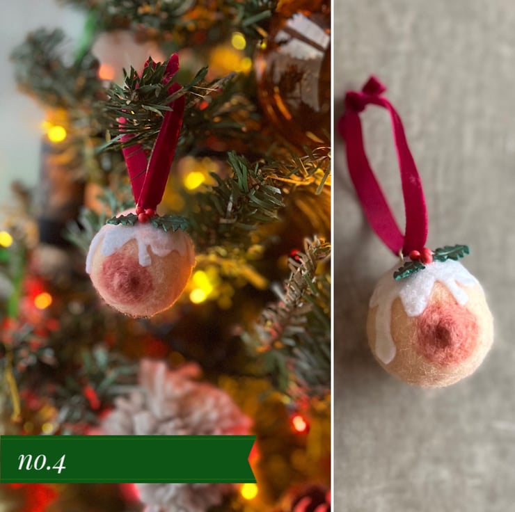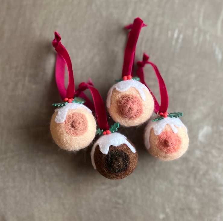 A plump hand needle felted booby with pert nipple, dripping with felt icing and adorned with handmade clay holly leaves and berries, finished with luxury velvet ribbon!