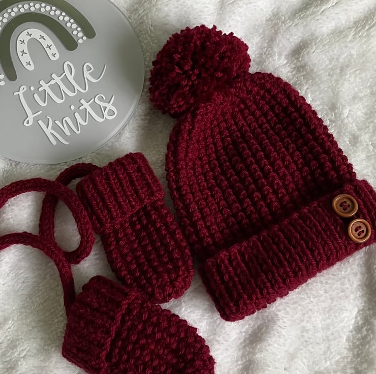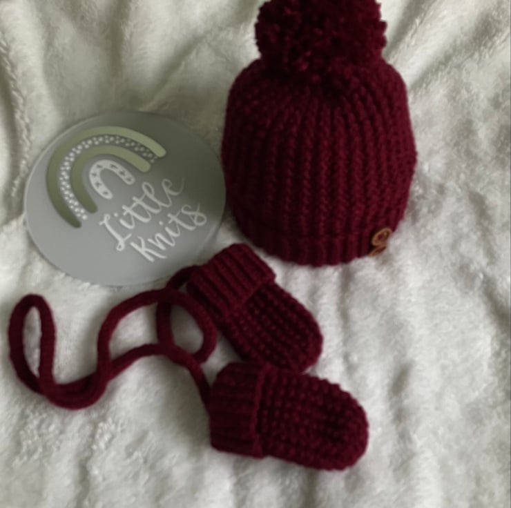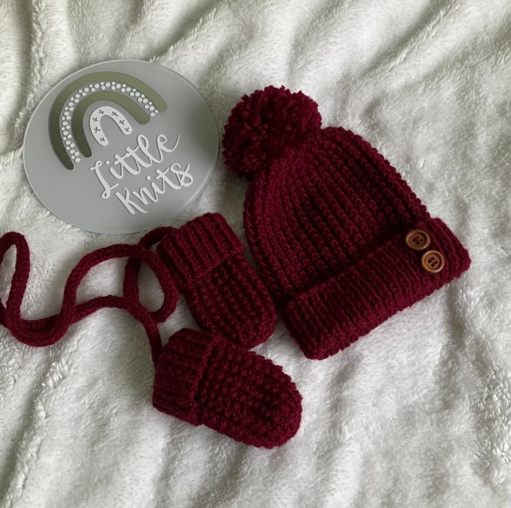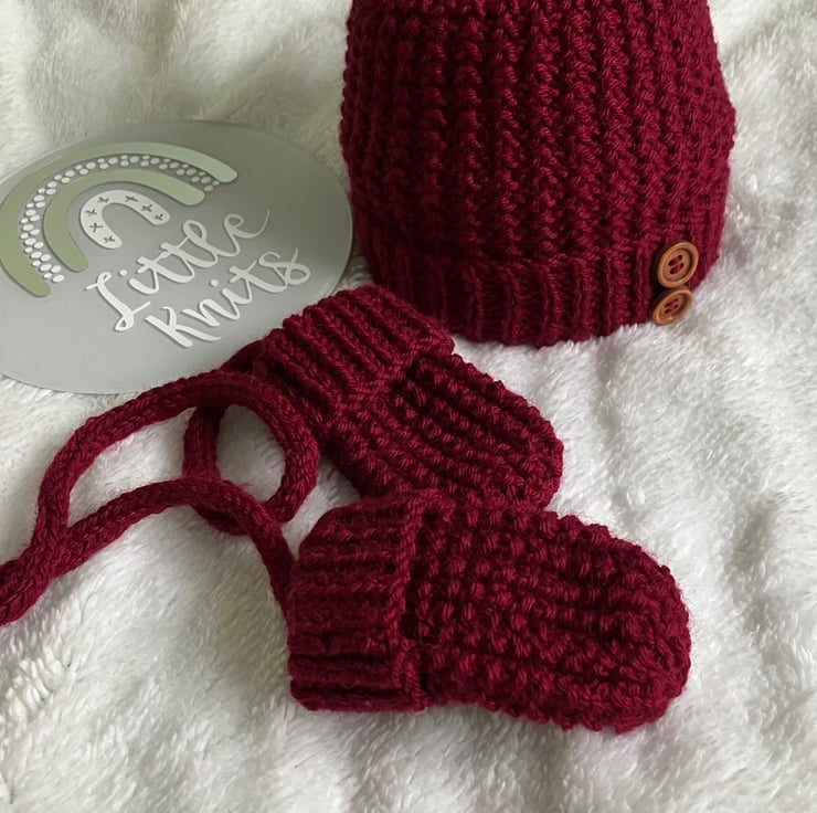 Hand knitted baby’s hat and mitts to fit approximate age 0-6 months. I have knitted this cute little set in a beautifully soft cranberry red merino/acrylic blend yarn with a cord attached to the mitts to prevent losses.