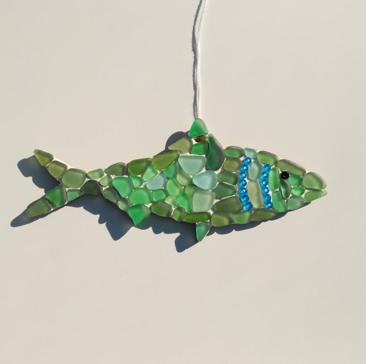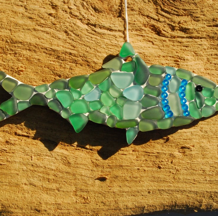 We've made this shark shape mosaic from tumbled sea glass. The lovely shades of aquamarine glass have come from old bottles, so each piece is curved. This gives the hanger a three dimensional effect. We've added turquoise glass beads to add a little decoration. The back of the hanger is top quality laser cut plywood.