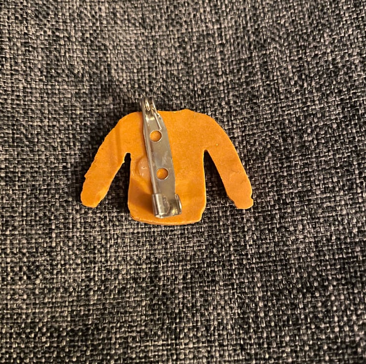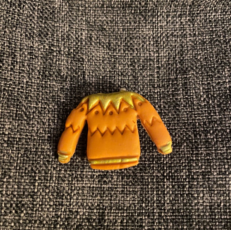 A gold and orange woolly jumper made from polymer clay with a silver badge back.