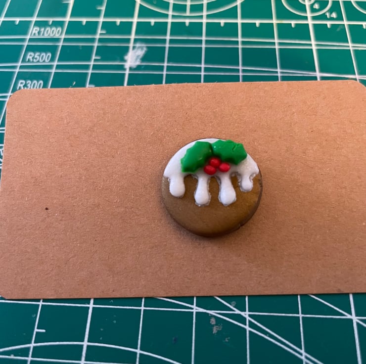 A Christmas pudding with holly leaves and berries made from polymer clay on a silver badge back.