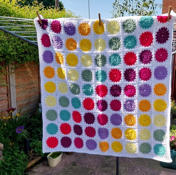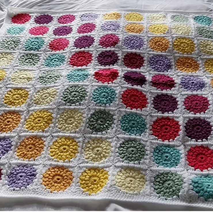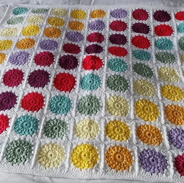 Pretty crochet baby blanket, this blanket is made up of 81 white squares with a colourful circle in the centre arranged in a diagonal pattern, with a white border.