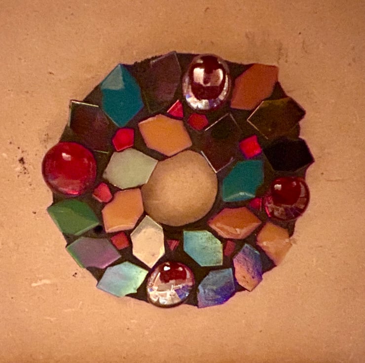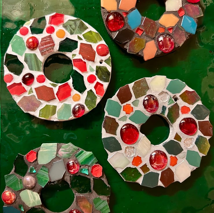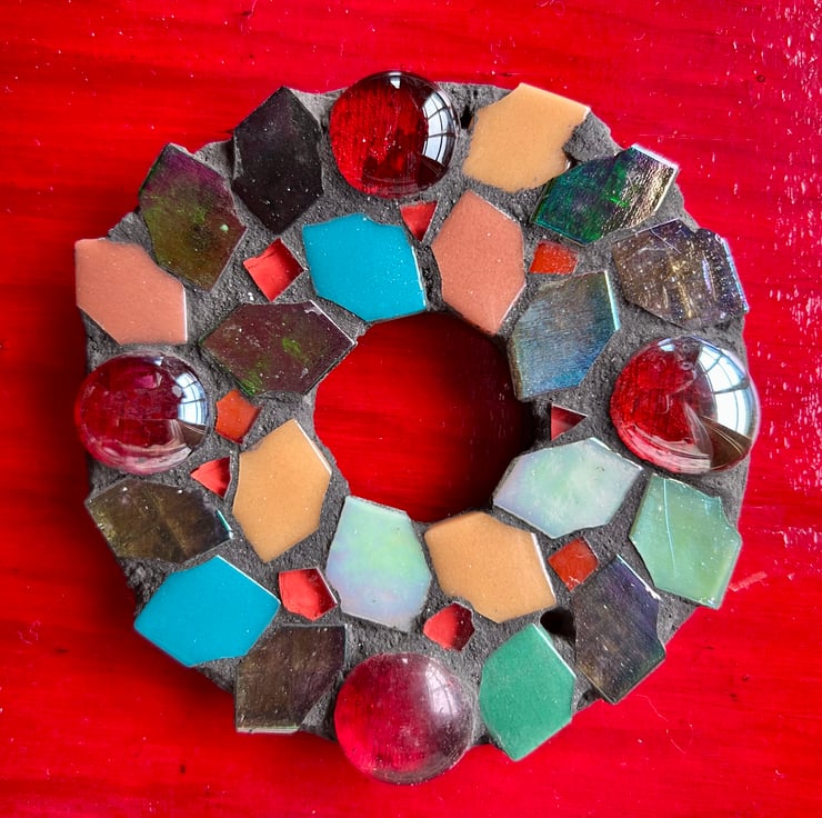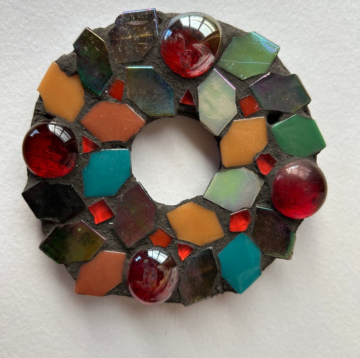A small mosaic wreath for Christmas made with hand cut stained glass holly leaves and berries and brightened with red glass nuggets. Made on plywood, this wreath is approximately 9cm in diameter and sealed with a black grout. This wreath catches the light beautifully and would look lovely hanging from your Christmas tree, tied to a special present or as part of your home Christmas decorations. Recommended for indoor use only.