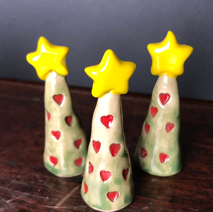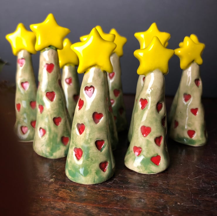 Hand painted ceramic teeny Christmas trees with a star toppers. Stamped with teeny heart shapes which have been hand painted with underglazes before a glossy transparent glaze has been applied and fired for a second time.