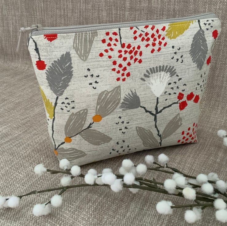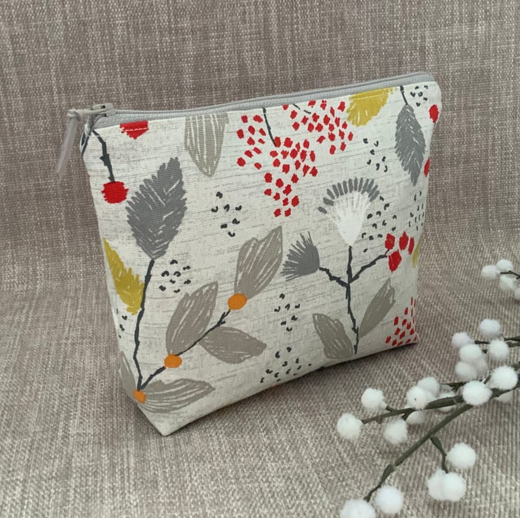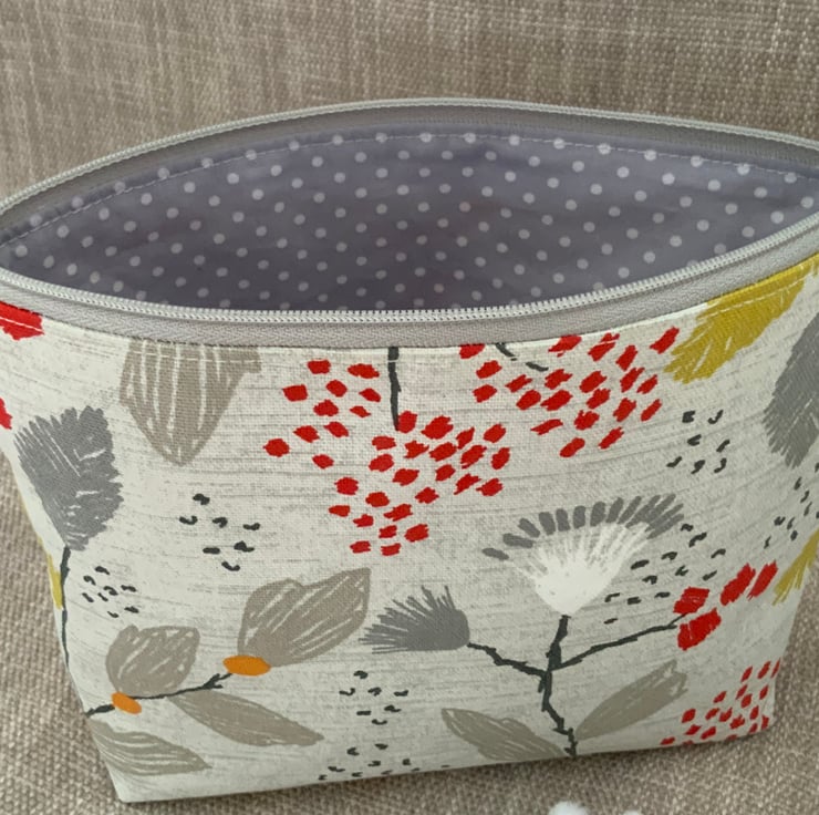 Beautiful square bottomed zipped cosmetic bag purse made from Scandi cotton fabric. This purse is lined with grey spotty cotton and interfaced to give it structure. Finished with faux suede cord on zip.